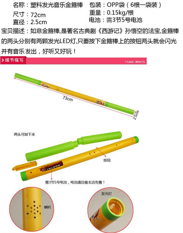 This product has two LED lights on both ends. Just press the button on the Golden Hobbit, and both ends will light up, along with the music of Monkey King, which is both beautiful and fun. It is a toy that children love.