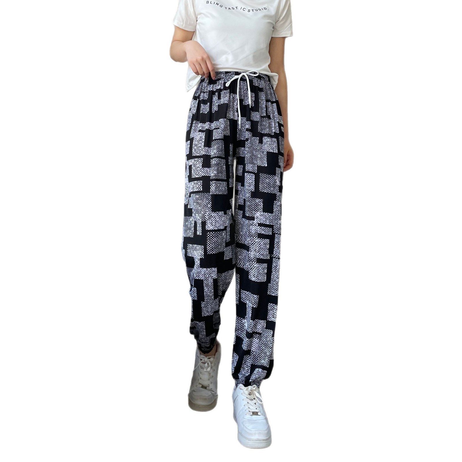 summer ice silk women's pants printed ankle banded pants beach cool pants artificial silk trousers small all-matching skinny pants women