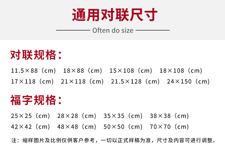 1180 * 170mm horizontal batch: 580 * 170mm (excluding fu character, opp bag couplet is calculated separately)