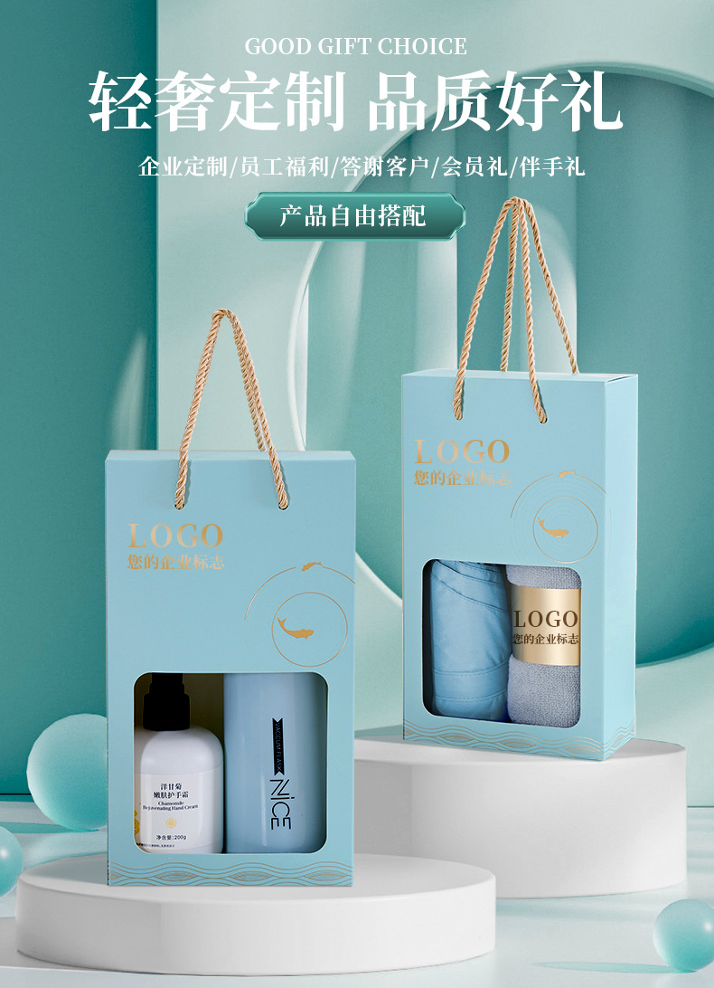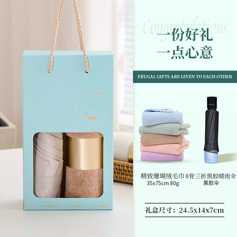 blue case + pure cotton towel + triple folding umbrella