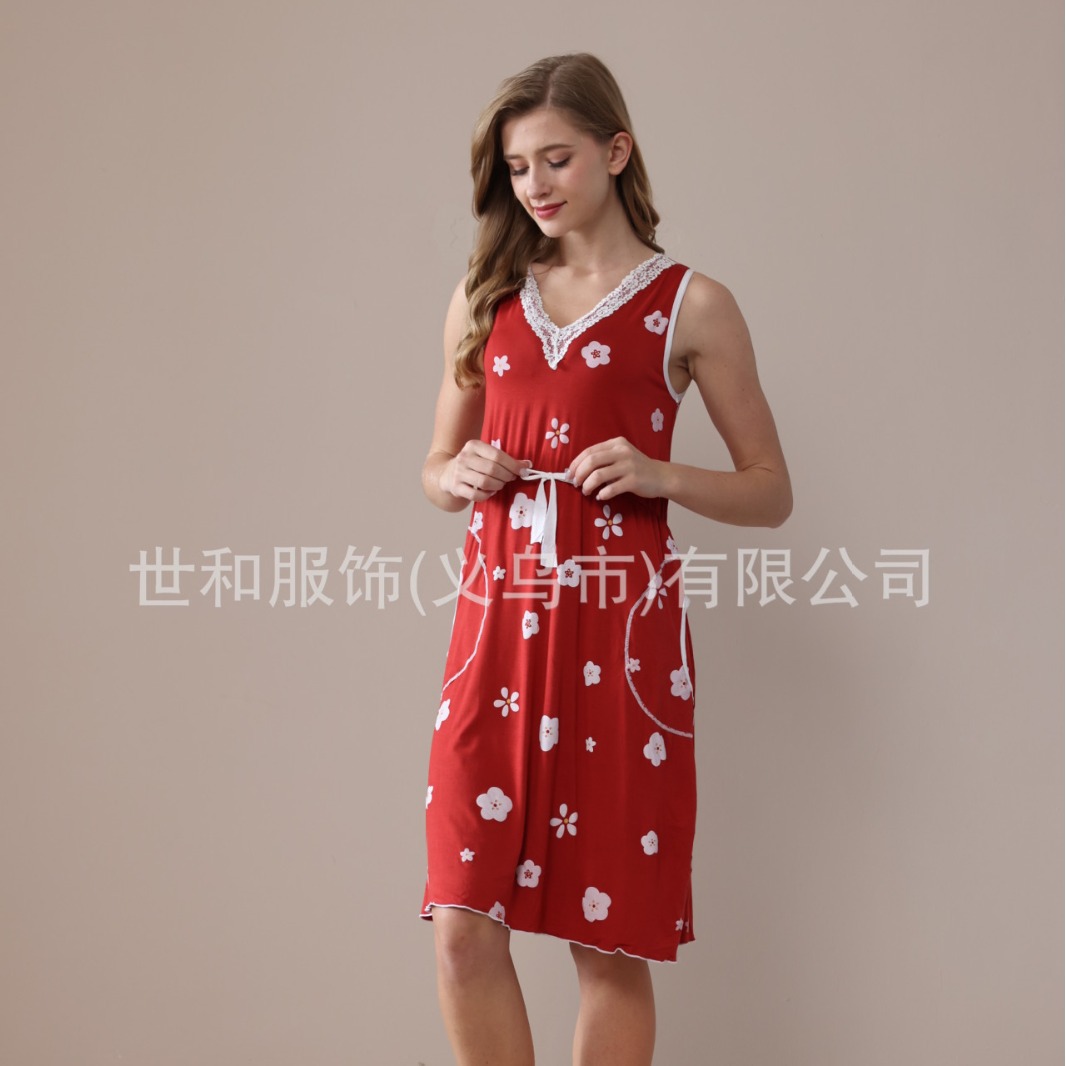spring and summer new modal rayon women's foreign trade lace wide shoulder printed waist drawstring double pocket