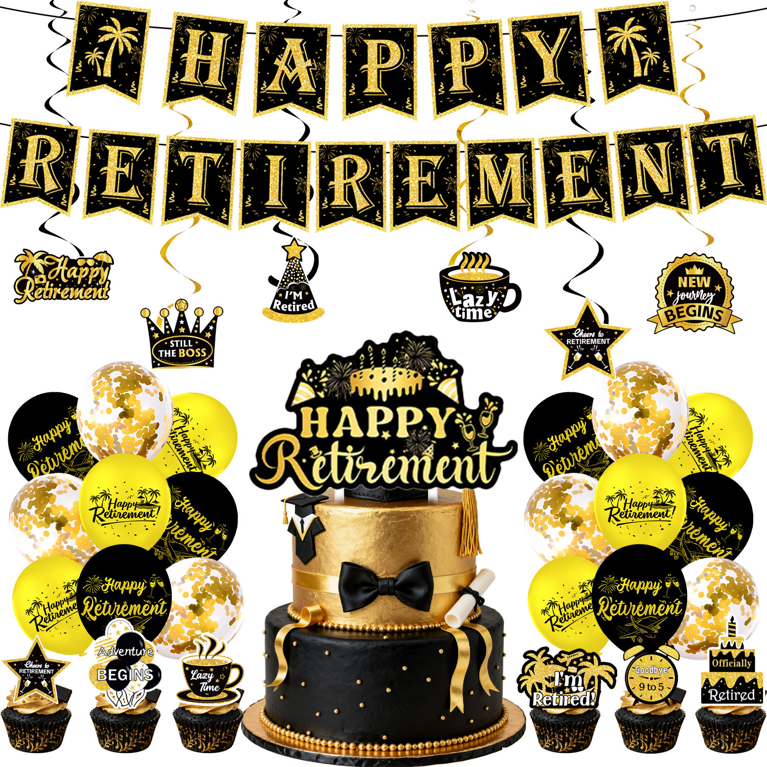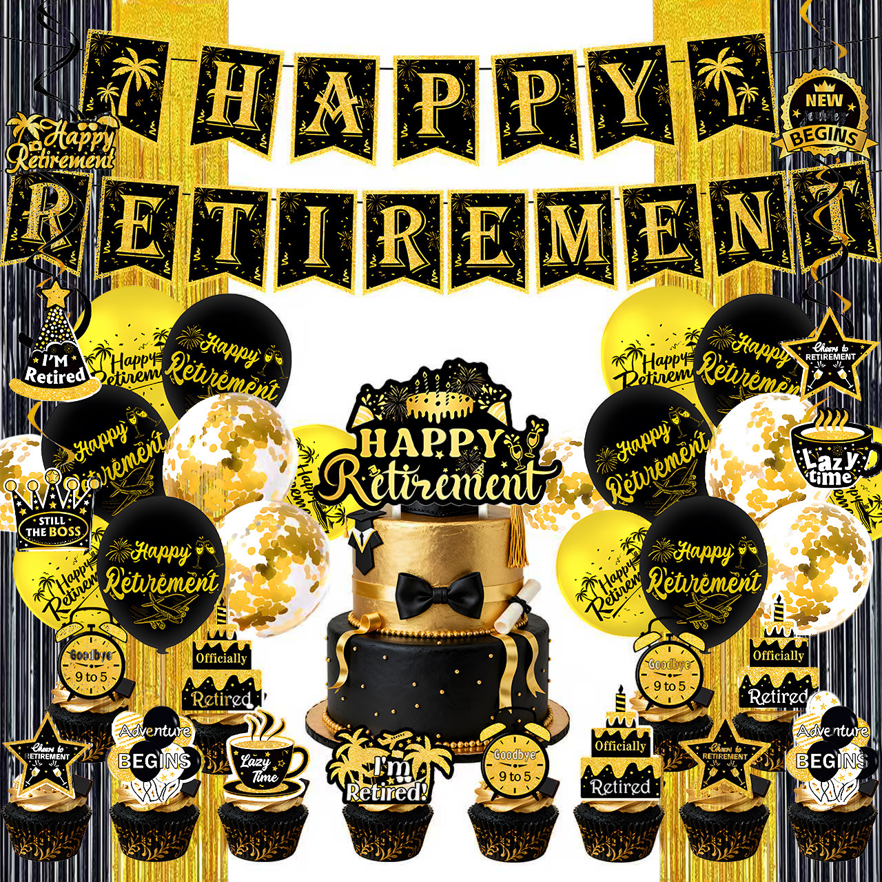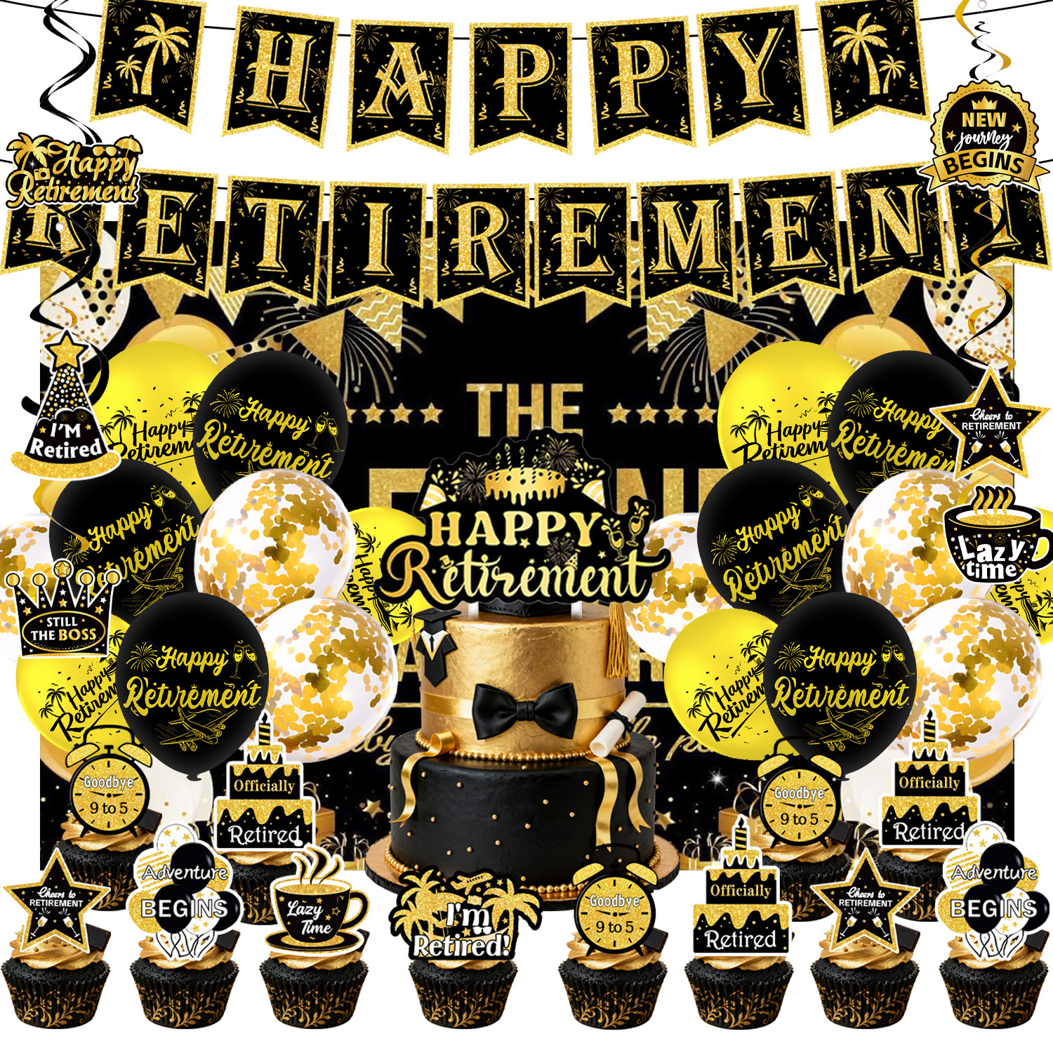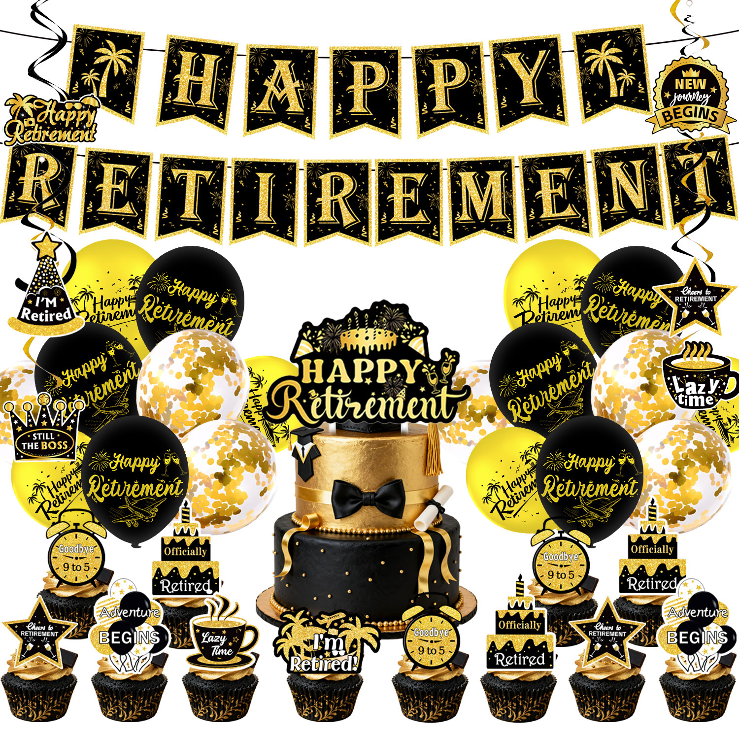 five-piece set: (hanging flag + big power strip + small power strip + hanging spin + balloon)-black gold retirement
