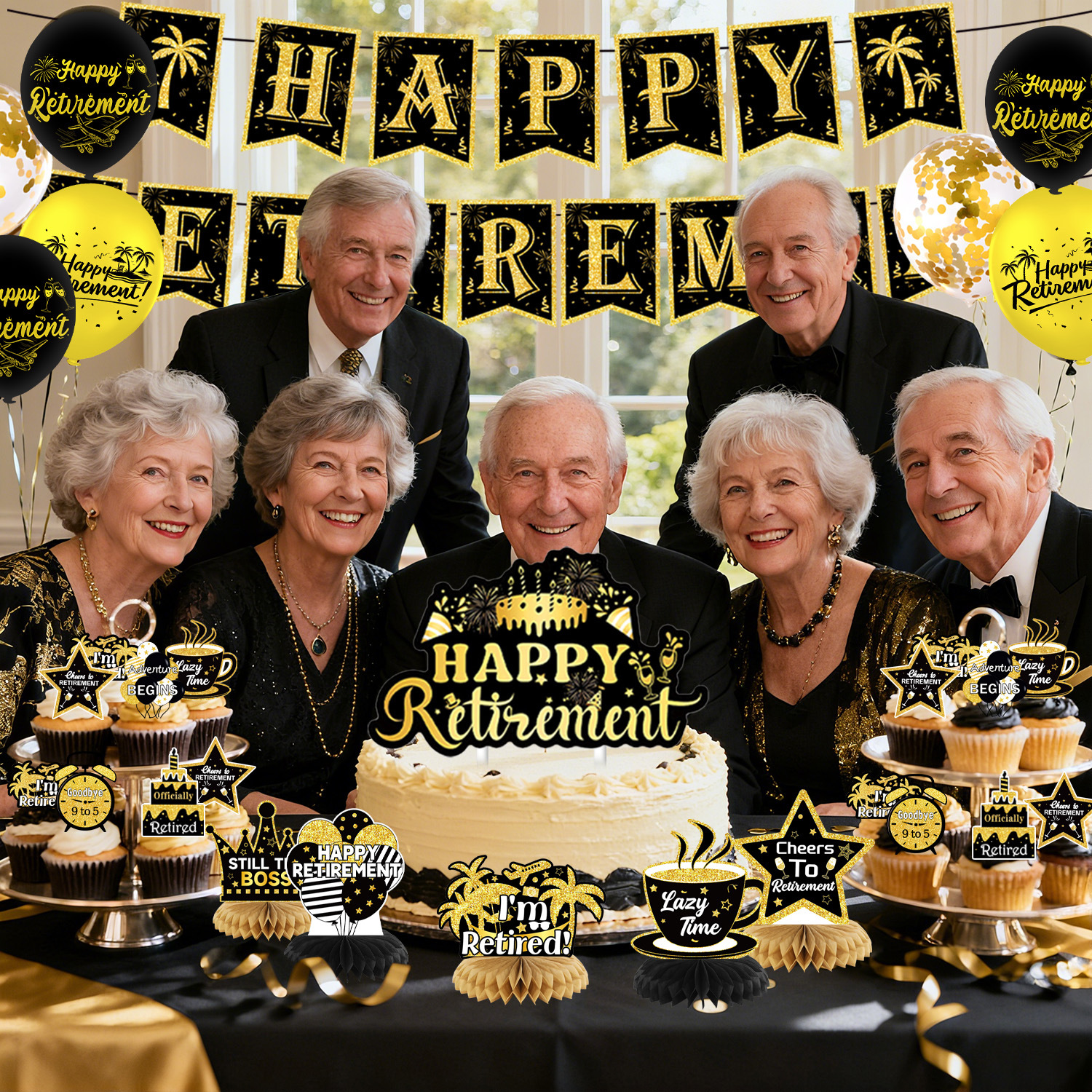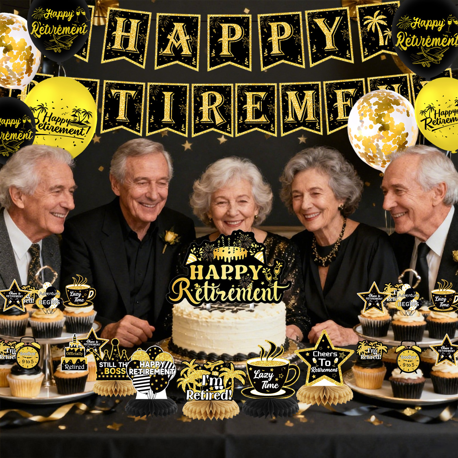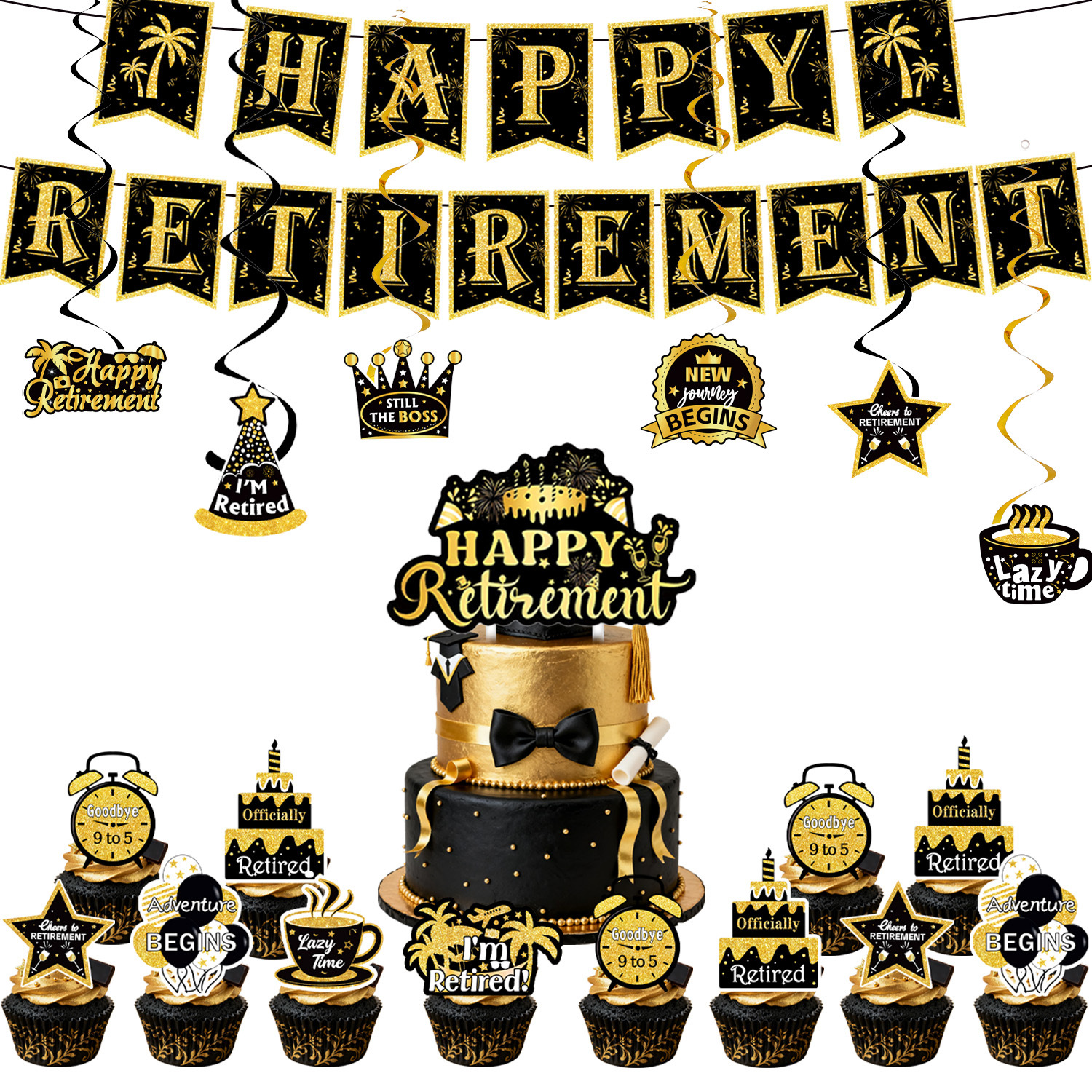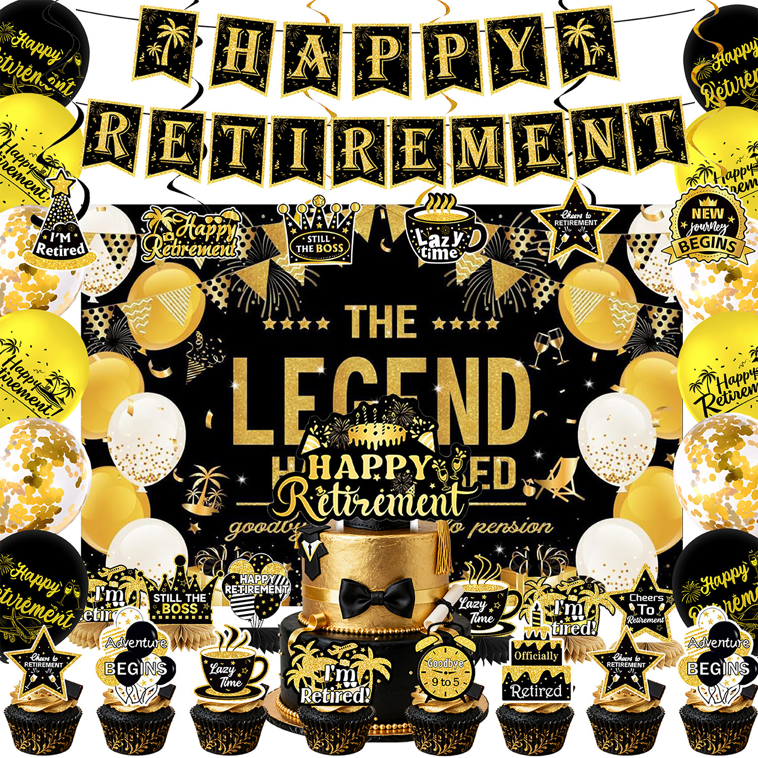 five-piece set: (hanging flag + big power strip + small power strip + hanging spin + balloon)-black gold retirement