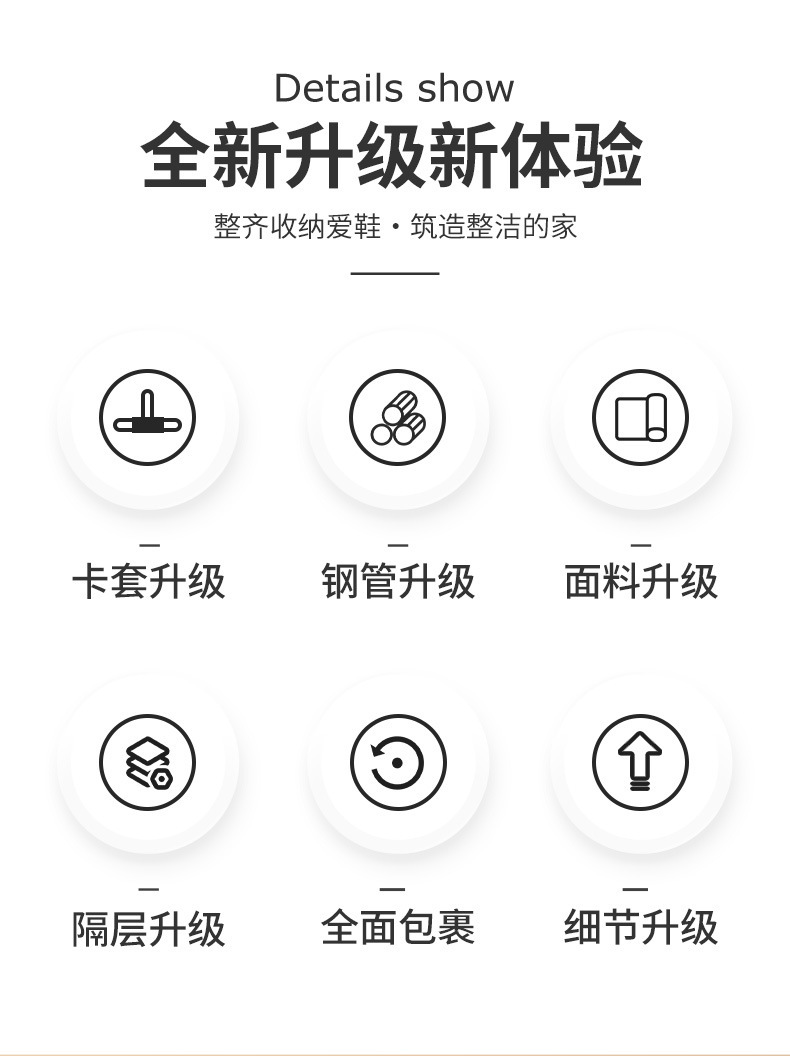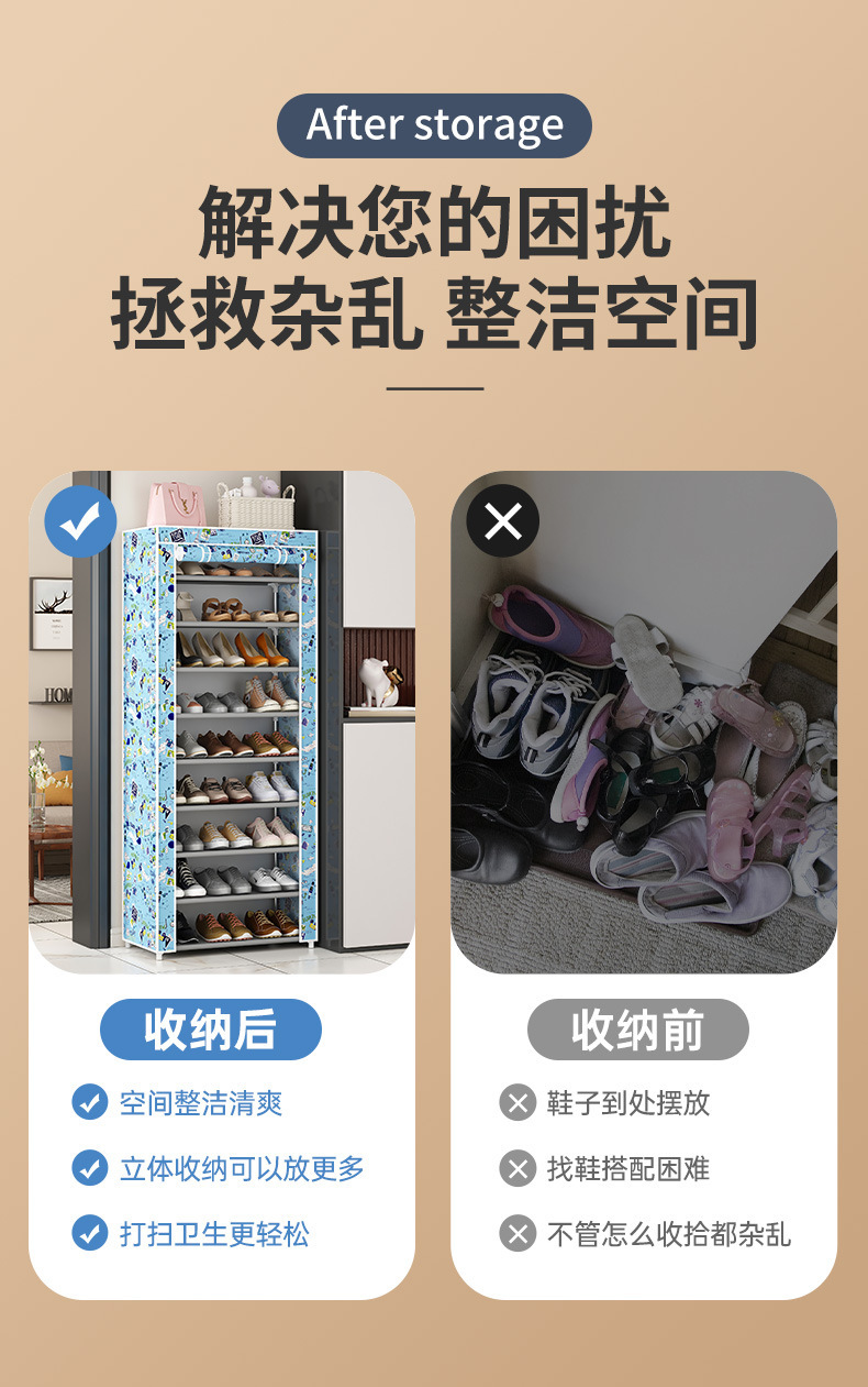 Product Description: This shoe rack is made of 9.8mm galvanized steel tubes, brand new eco-friendly PP connectors, and a non-woven fabric cover, making it both aesthetically pleasing and practical.