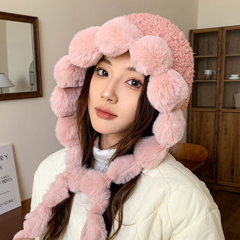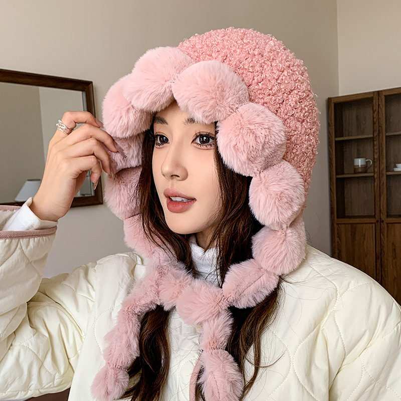 sweet cute white plush earmuffs hat female winter teddy fur thickened thermal lei feng cap face-looking small bag cap