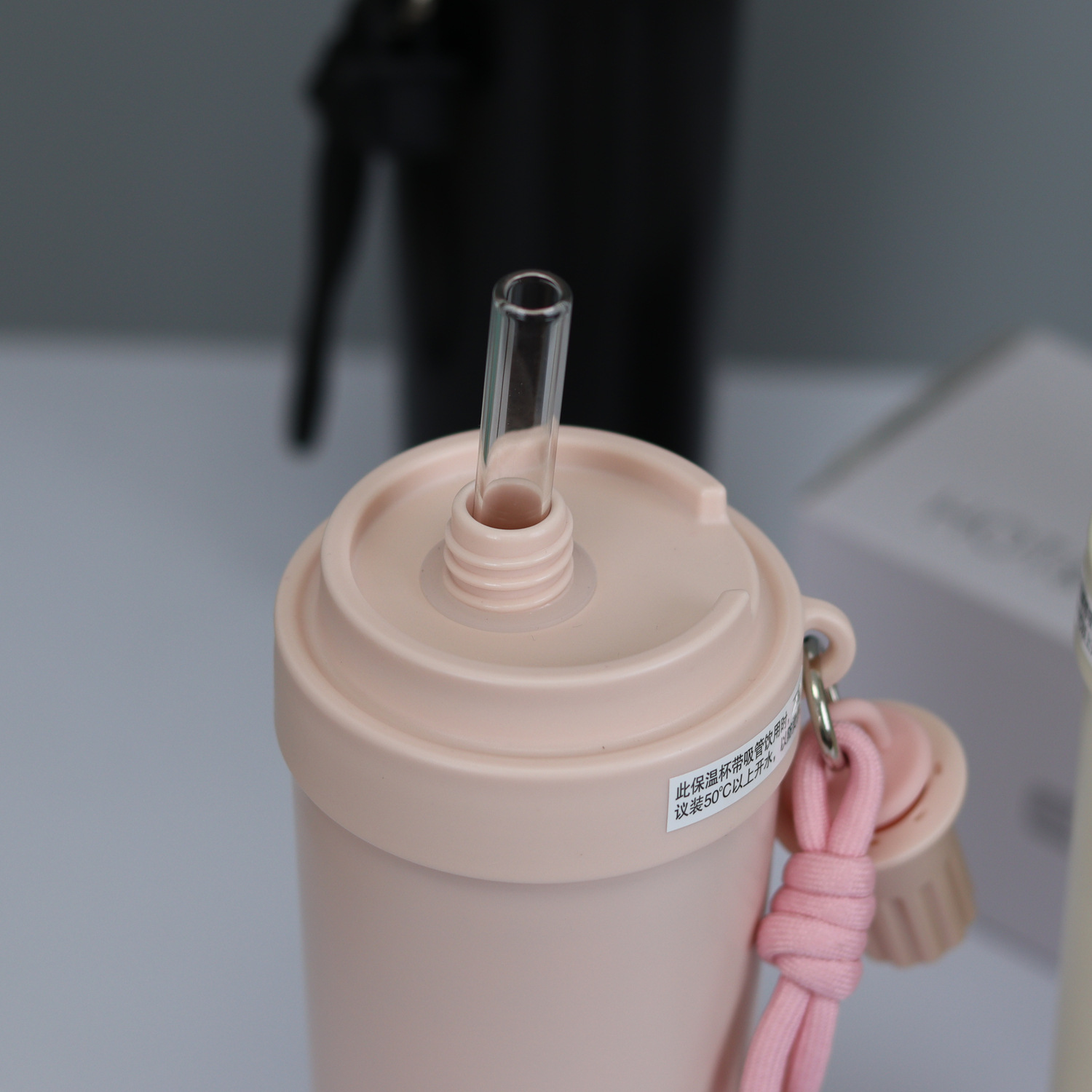 Independent transparent glass straw with a silicone elastic sleeve, protecting the straw and popping out automatically when opening the lid.
