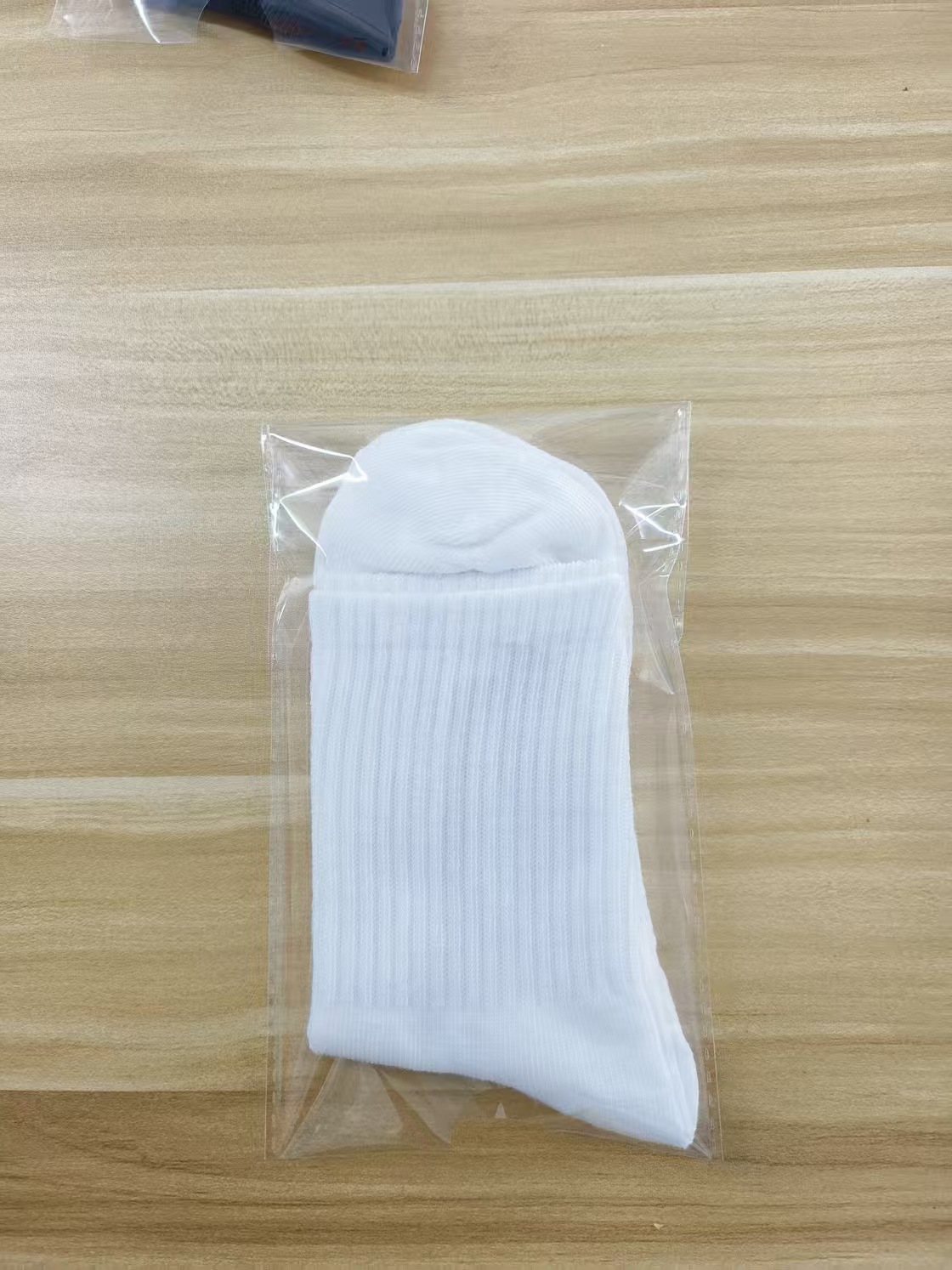white short socks, individually packaged in an opp bag.