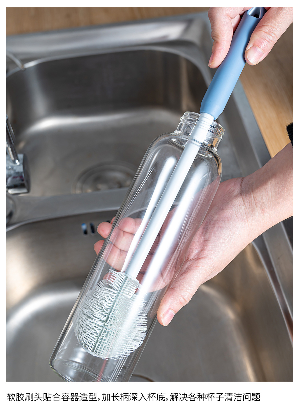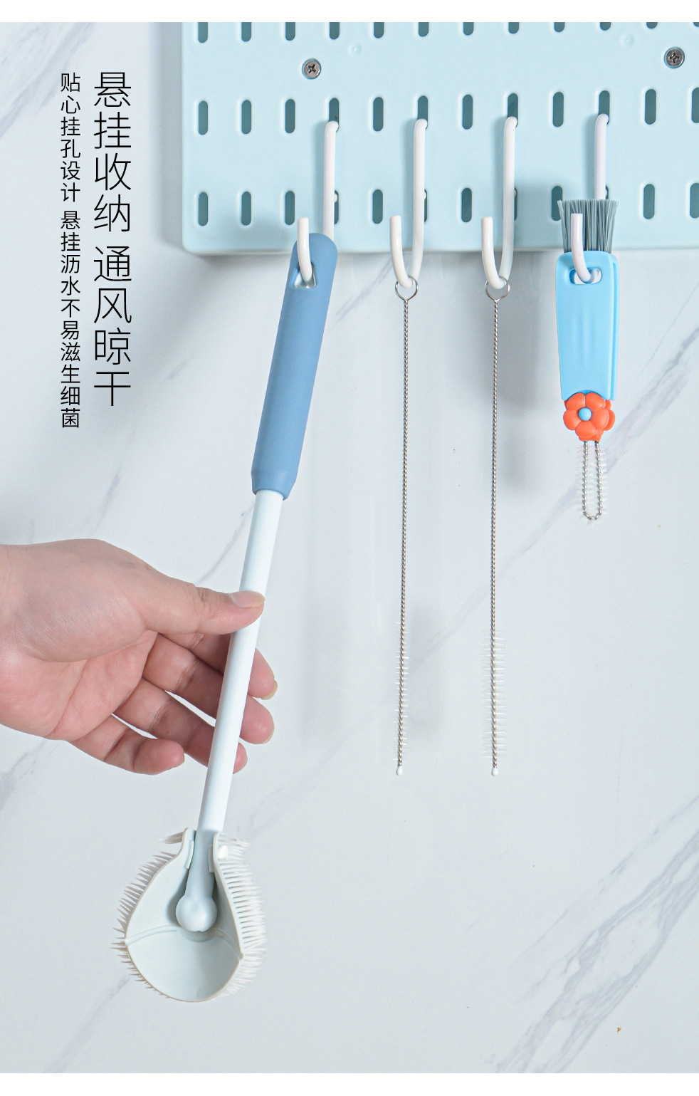 long handle soft rubber baby bottle brush-blue