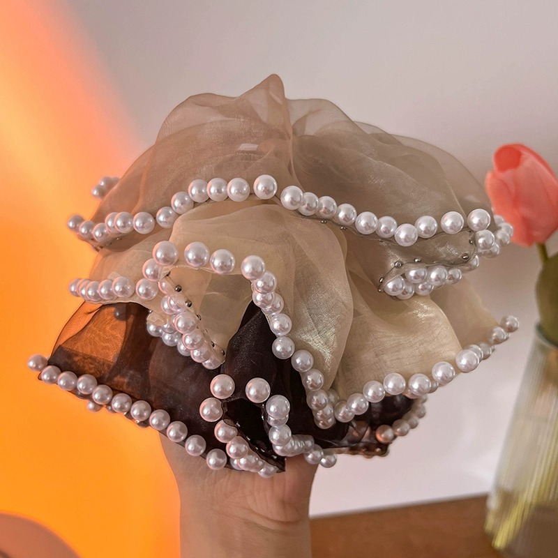 beige mesh pearl large hair tie