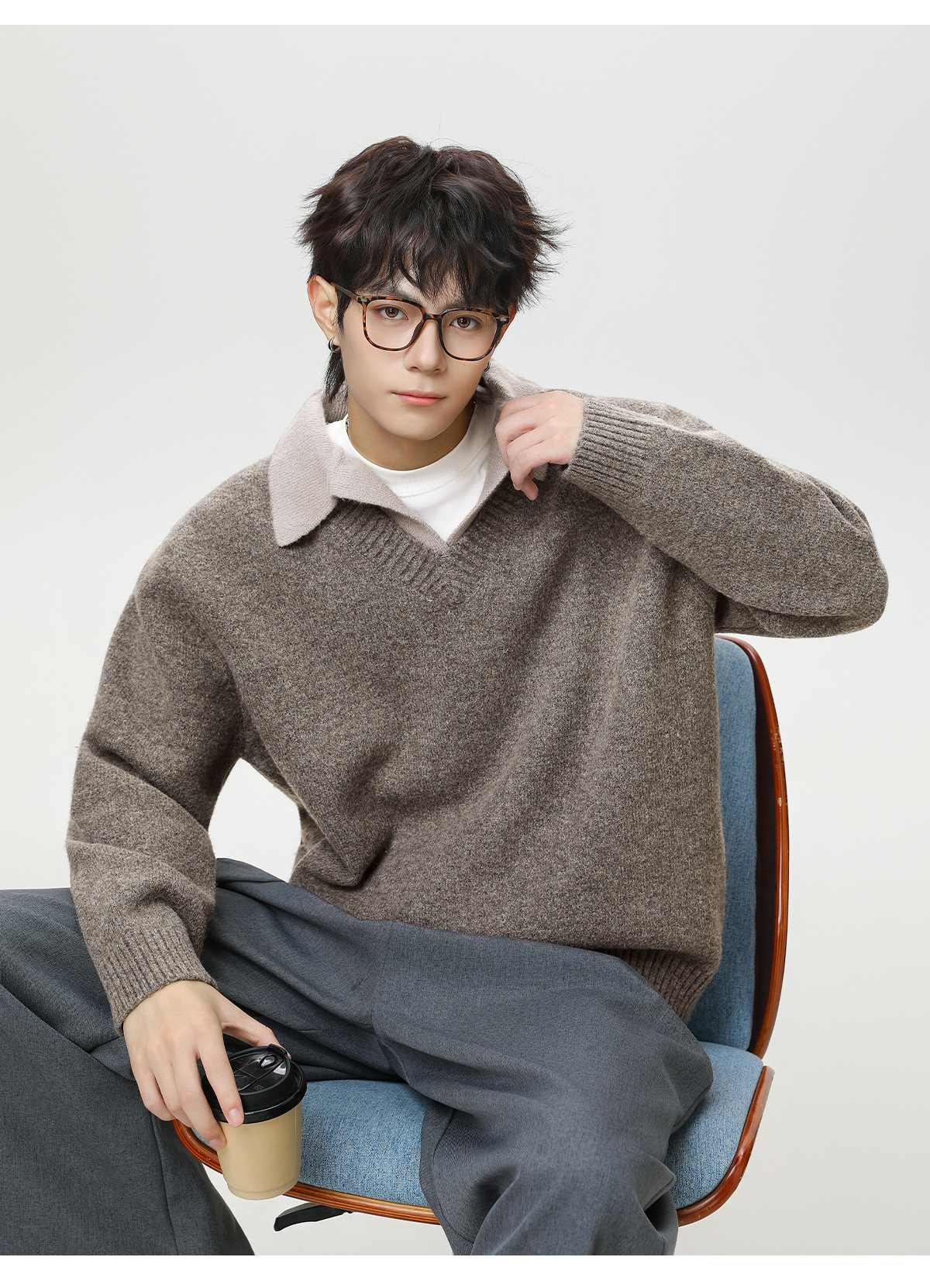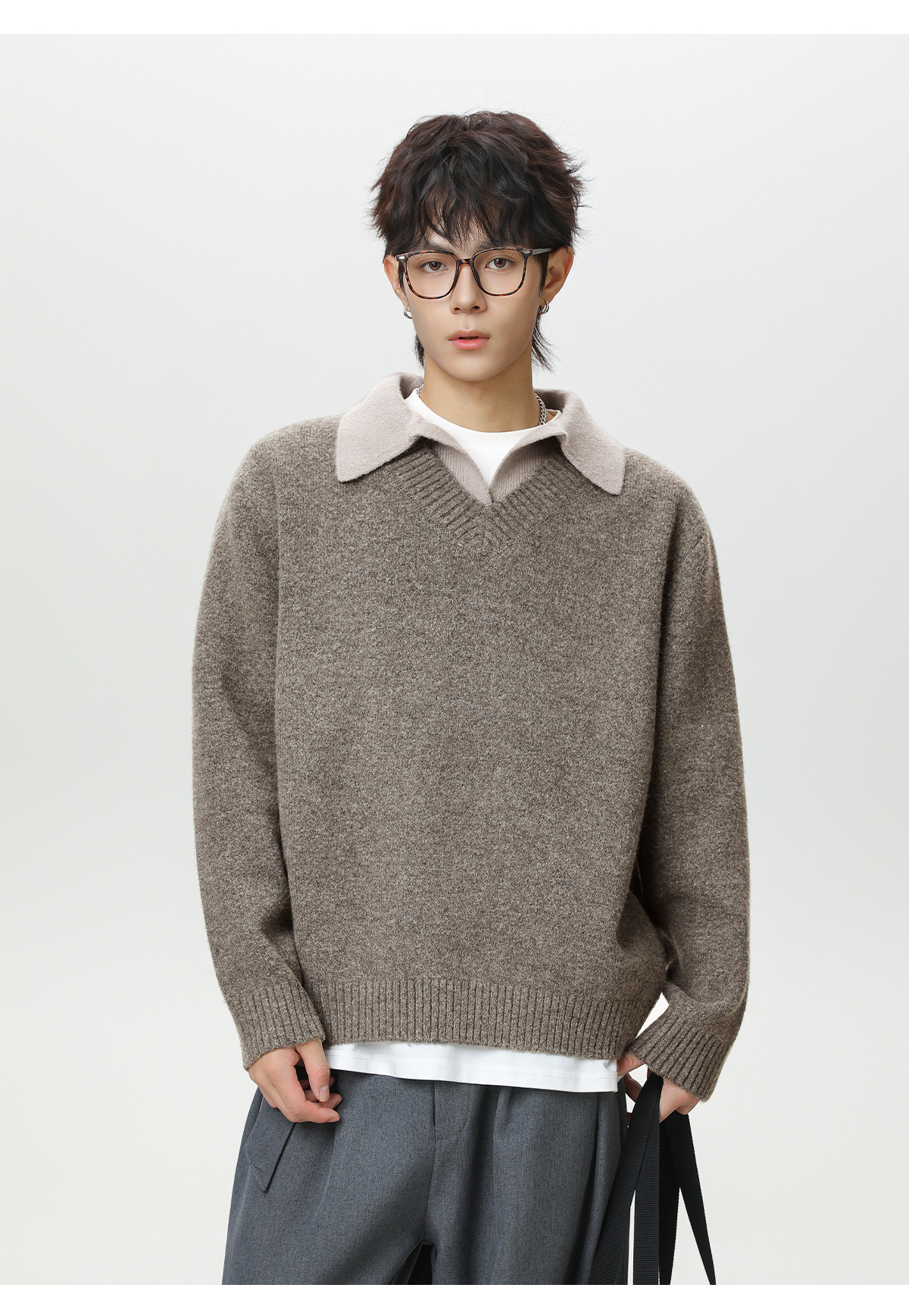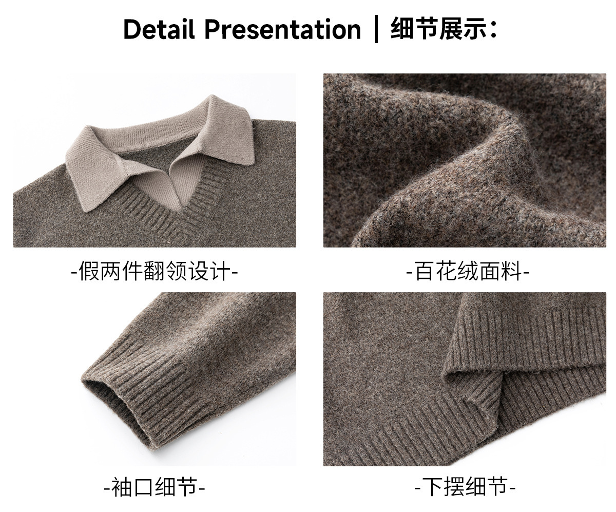 old money style texture fake two-piece v-neck sweater men's autumn and winter new retro lapels sweater warm coat