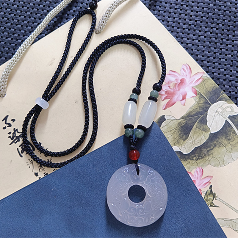 white chalcedony double pixiu peace buckle (with white metal beads black rope)