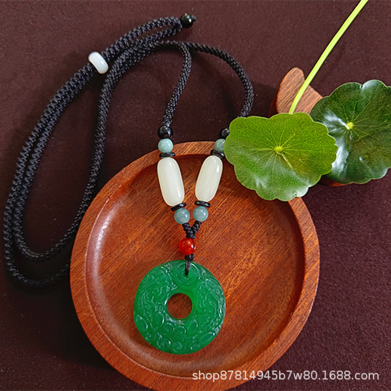 green chalcedony double pixiu safety buckle pendant (with emerald beads black rope)