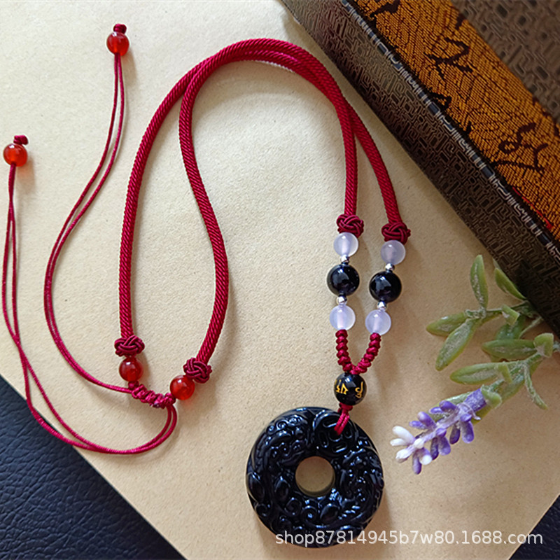obsidian double pixiu safety buckle pendant (with agate beads purplish red rope)