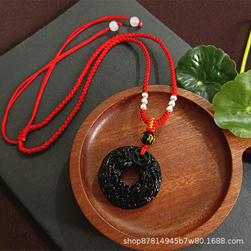 obsidian double pixiu peace buckle (with white metal beads red rope)