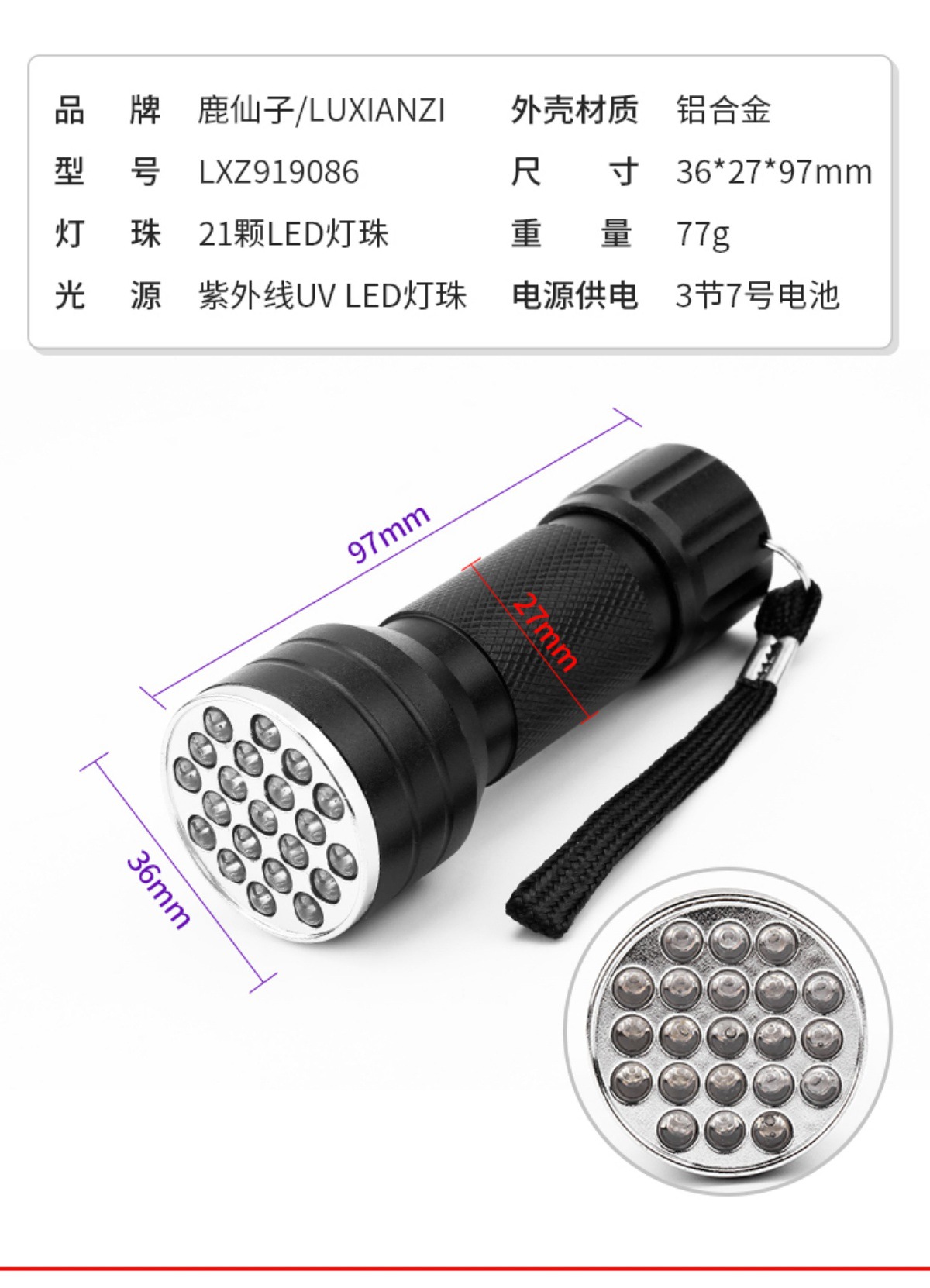 21 lights violet flashlight [+3 batteries] 0-5w