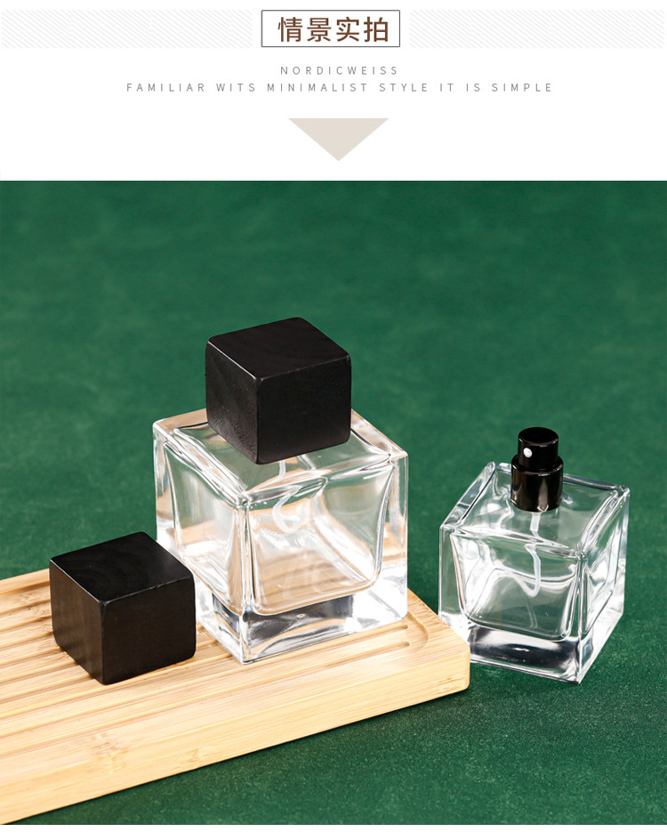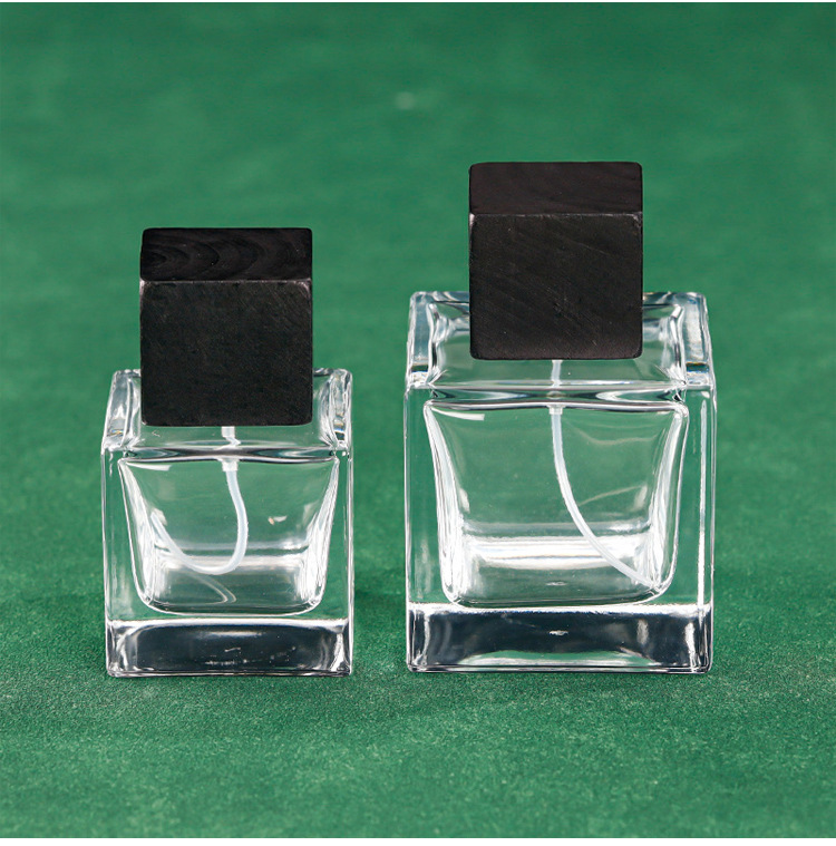 50ml = black nozzle + wooden lid; transparent; glass