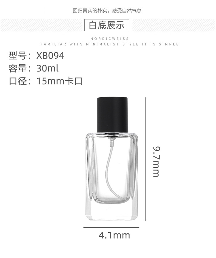 30ml + black nozzle + black light cover; transparent; glass