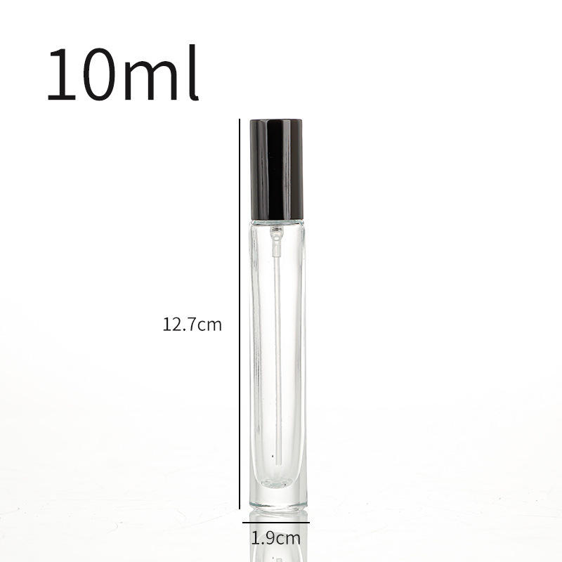 10ml-cylinder bottle + black cover; transparent; glass