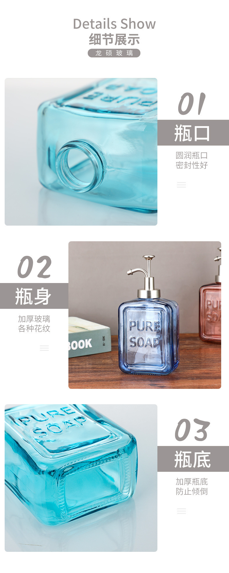 matte black pump head; blue; glass