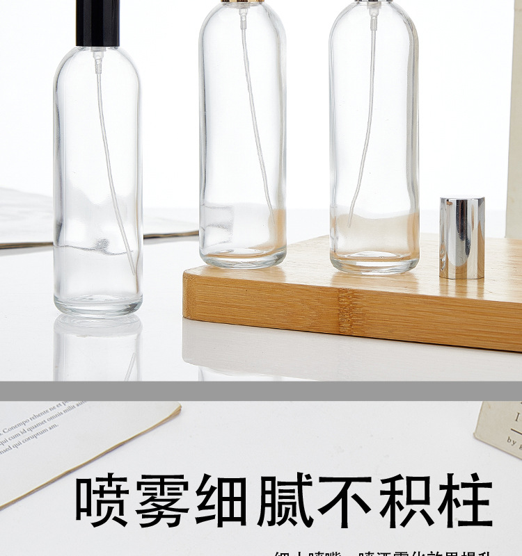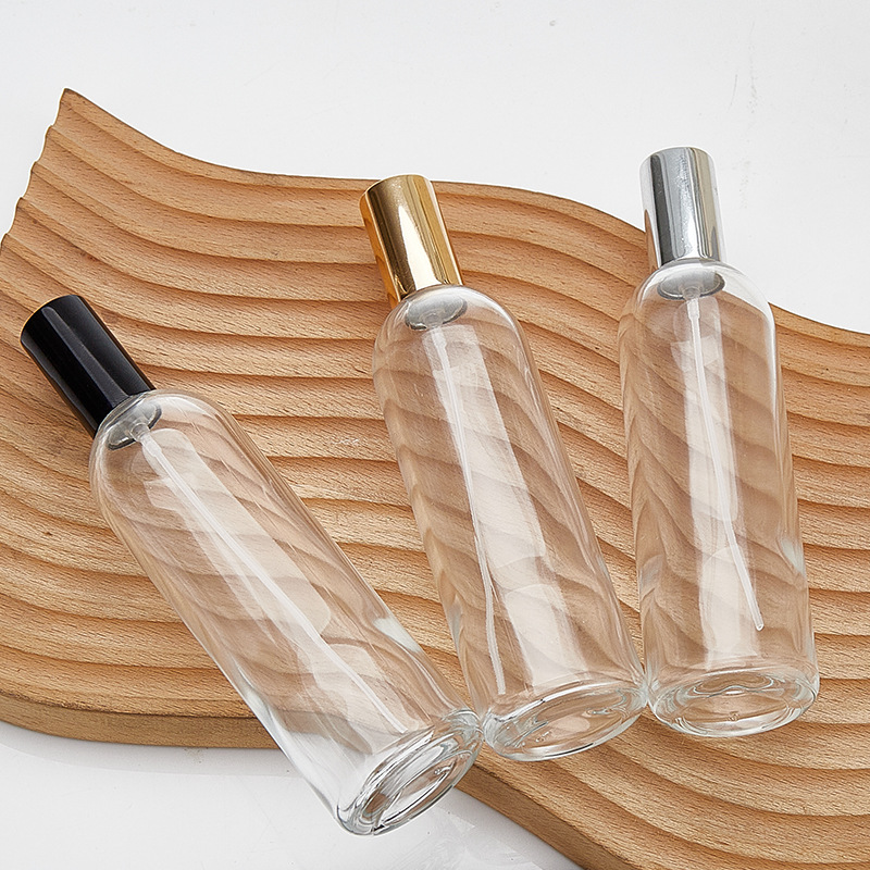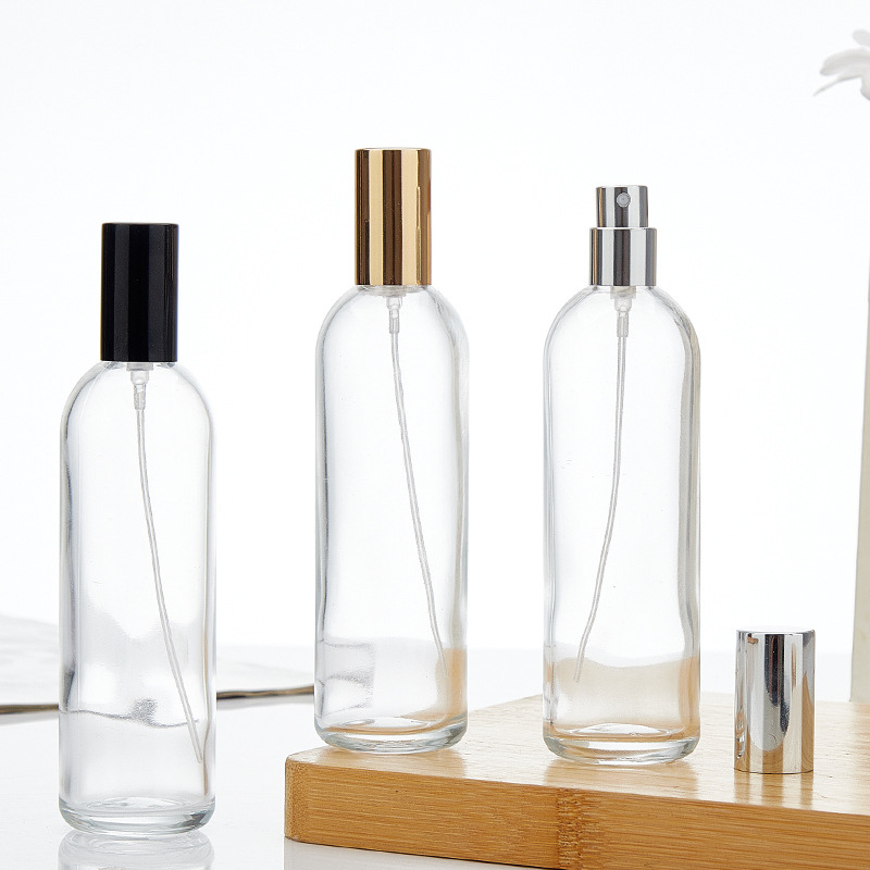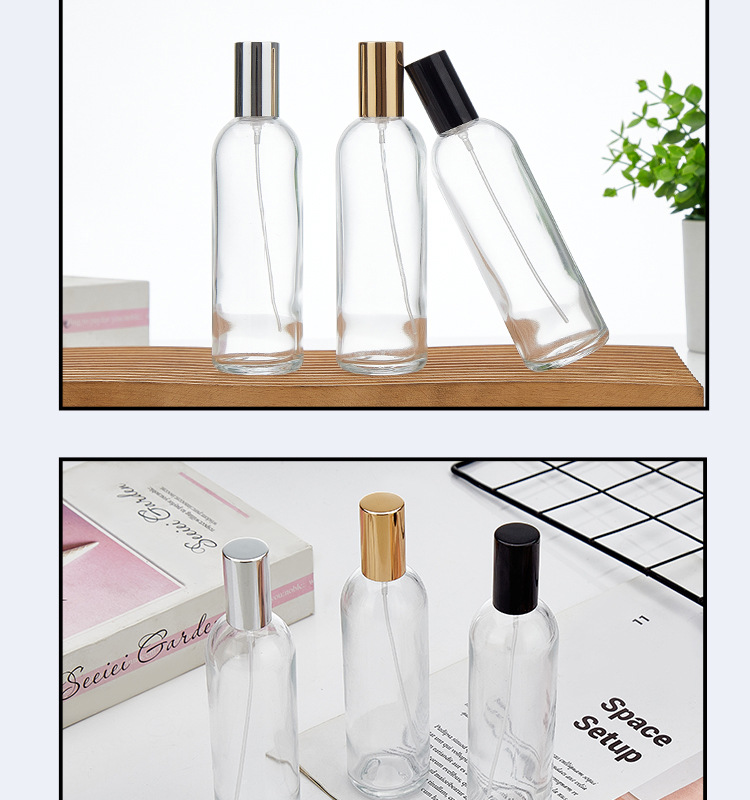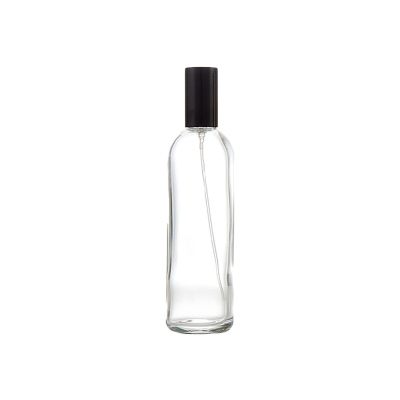 100ml transparent bottle + plastic card nozzle (black) + black cover; transparent; glass