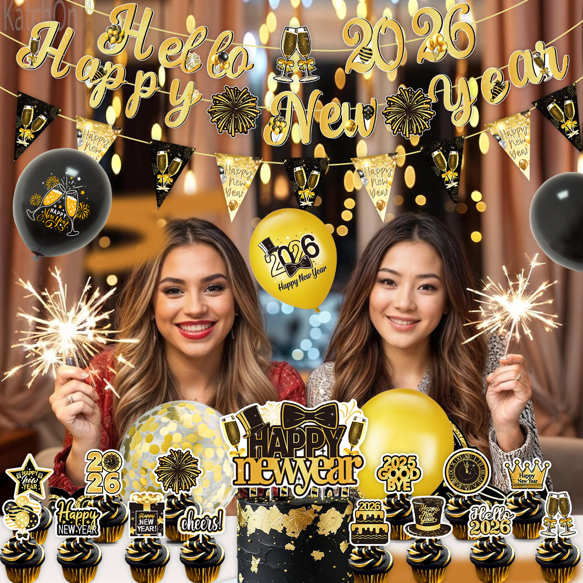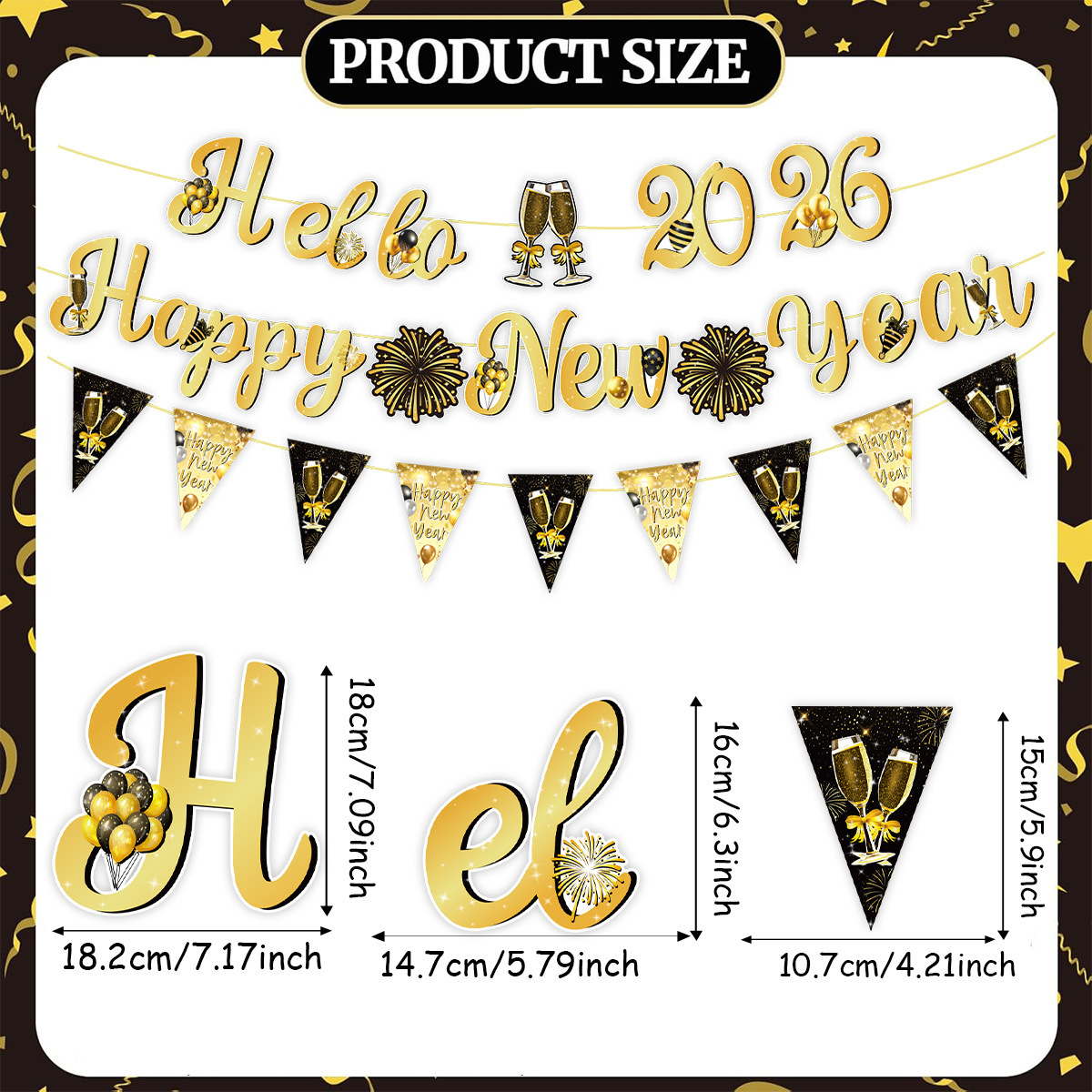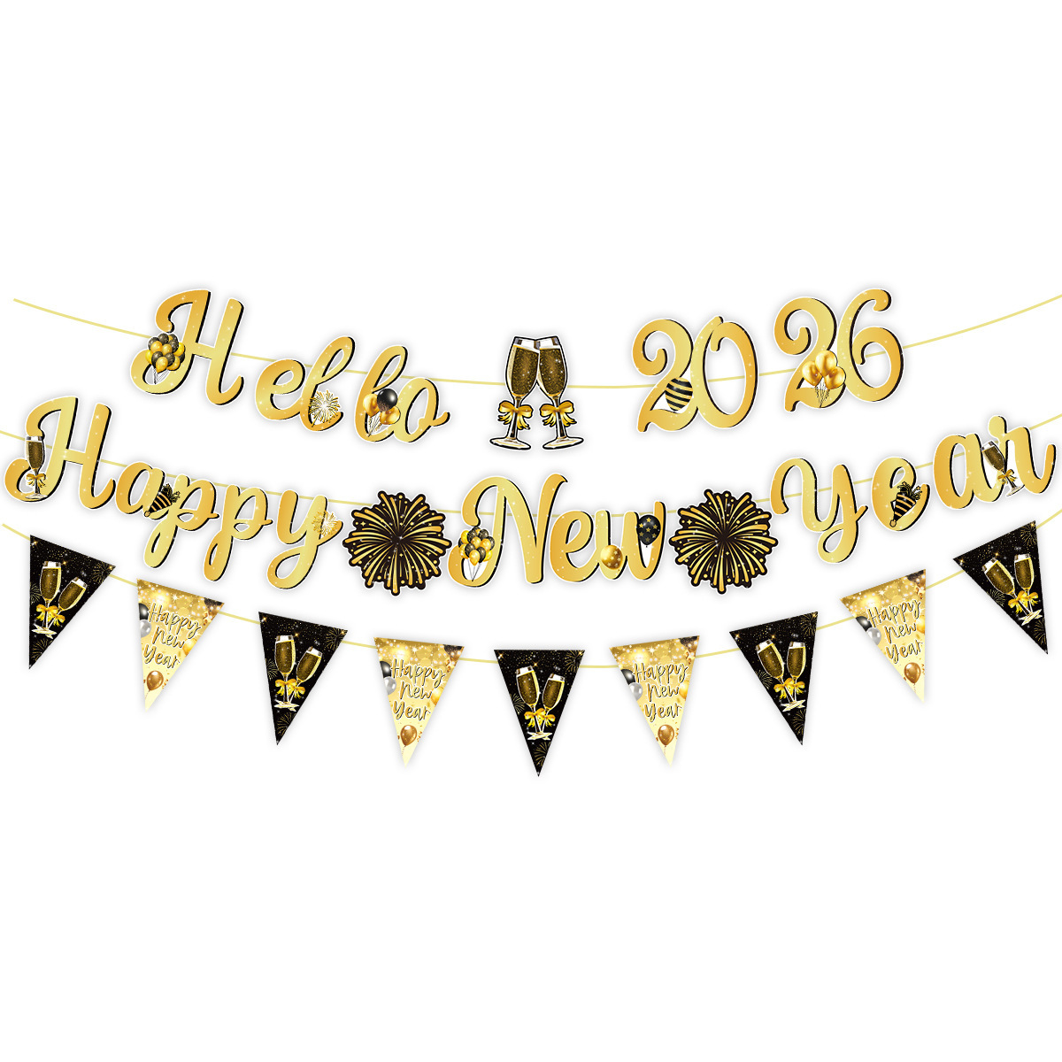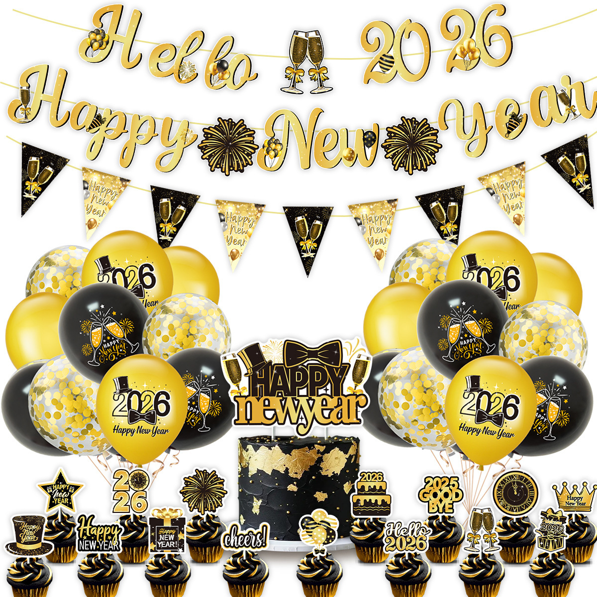 set: 1 hanging flag +20 balloon +16 cake insert +2 flat black ribbon