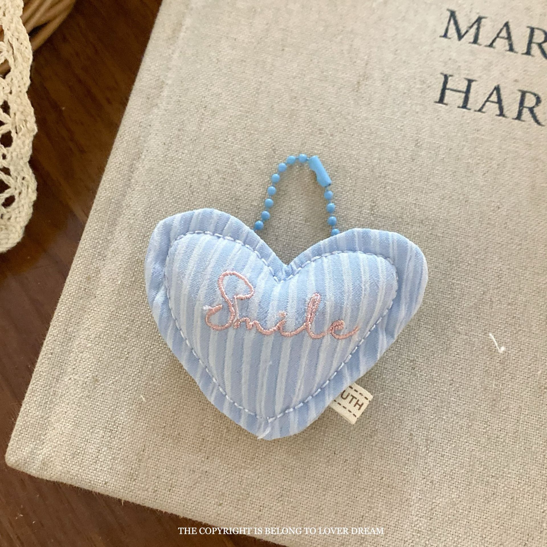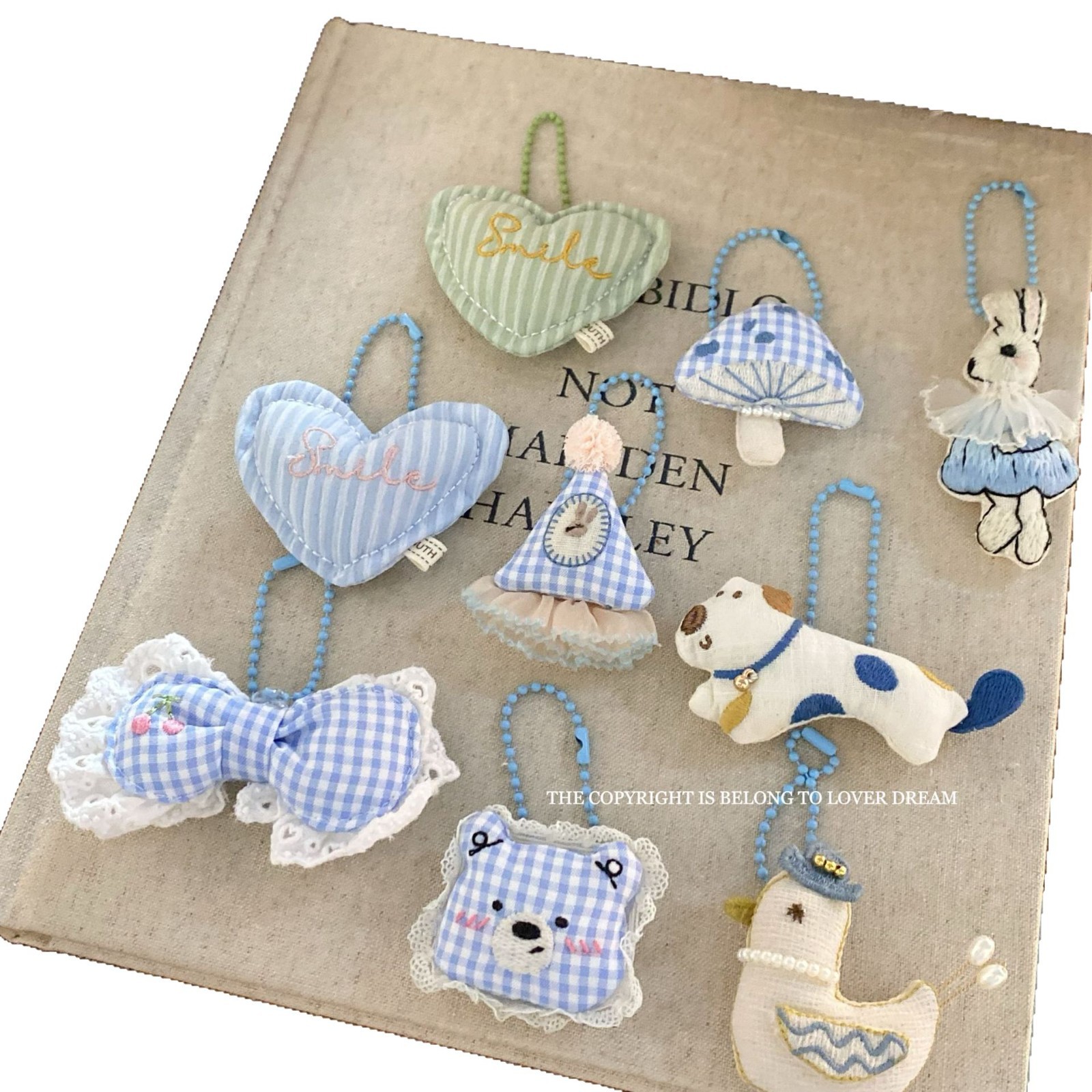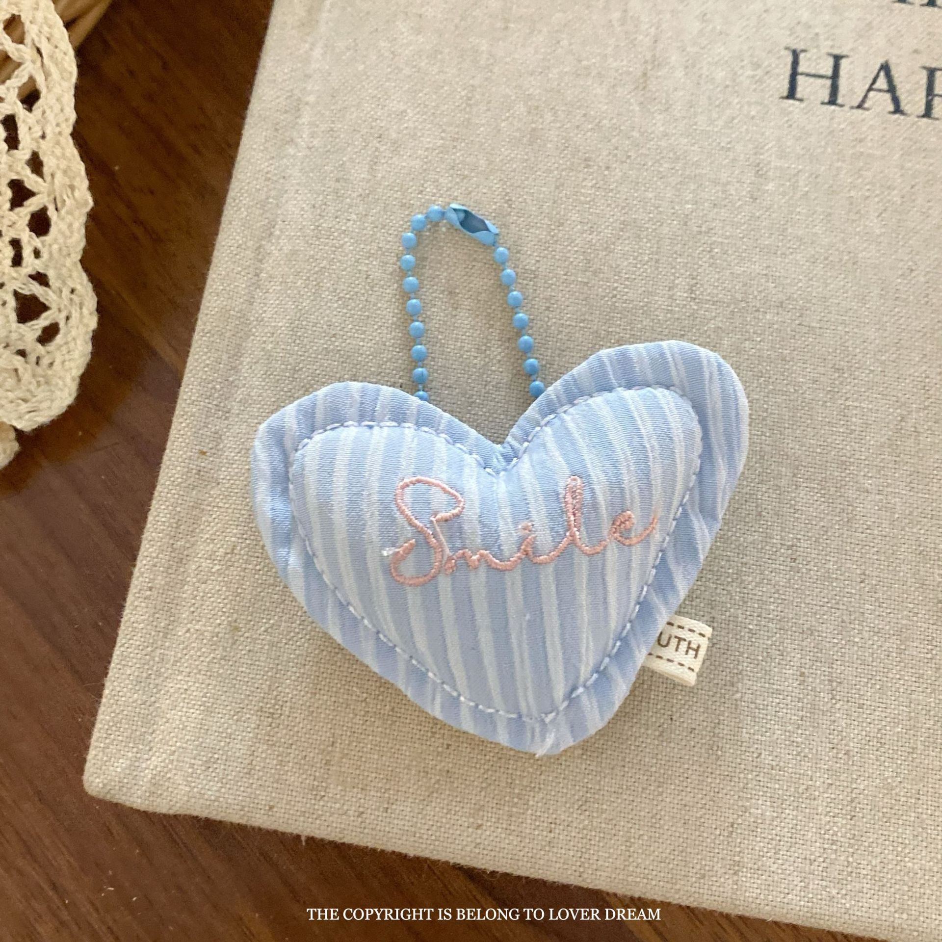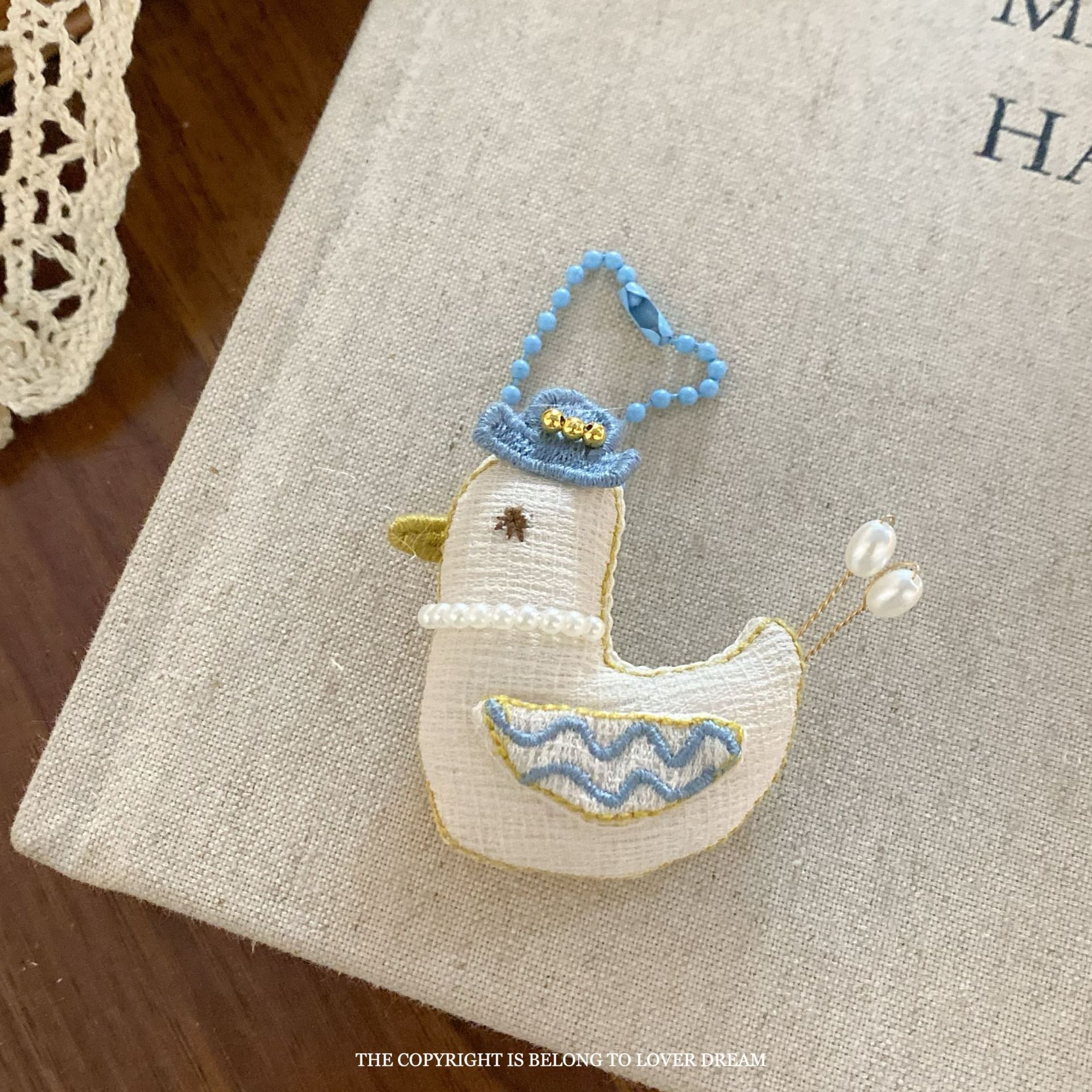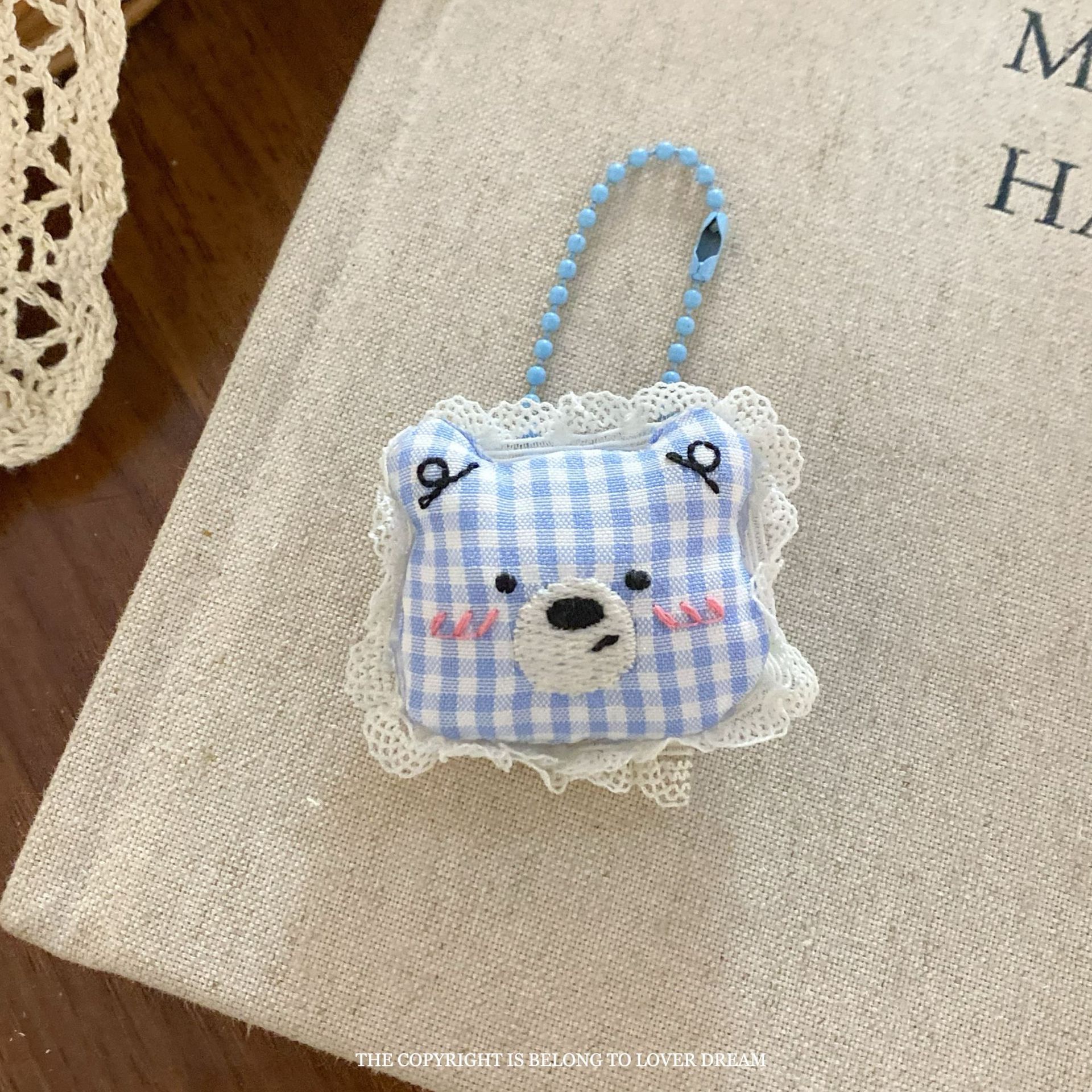 white lace edge blue and white striped bear pillow bead necklace