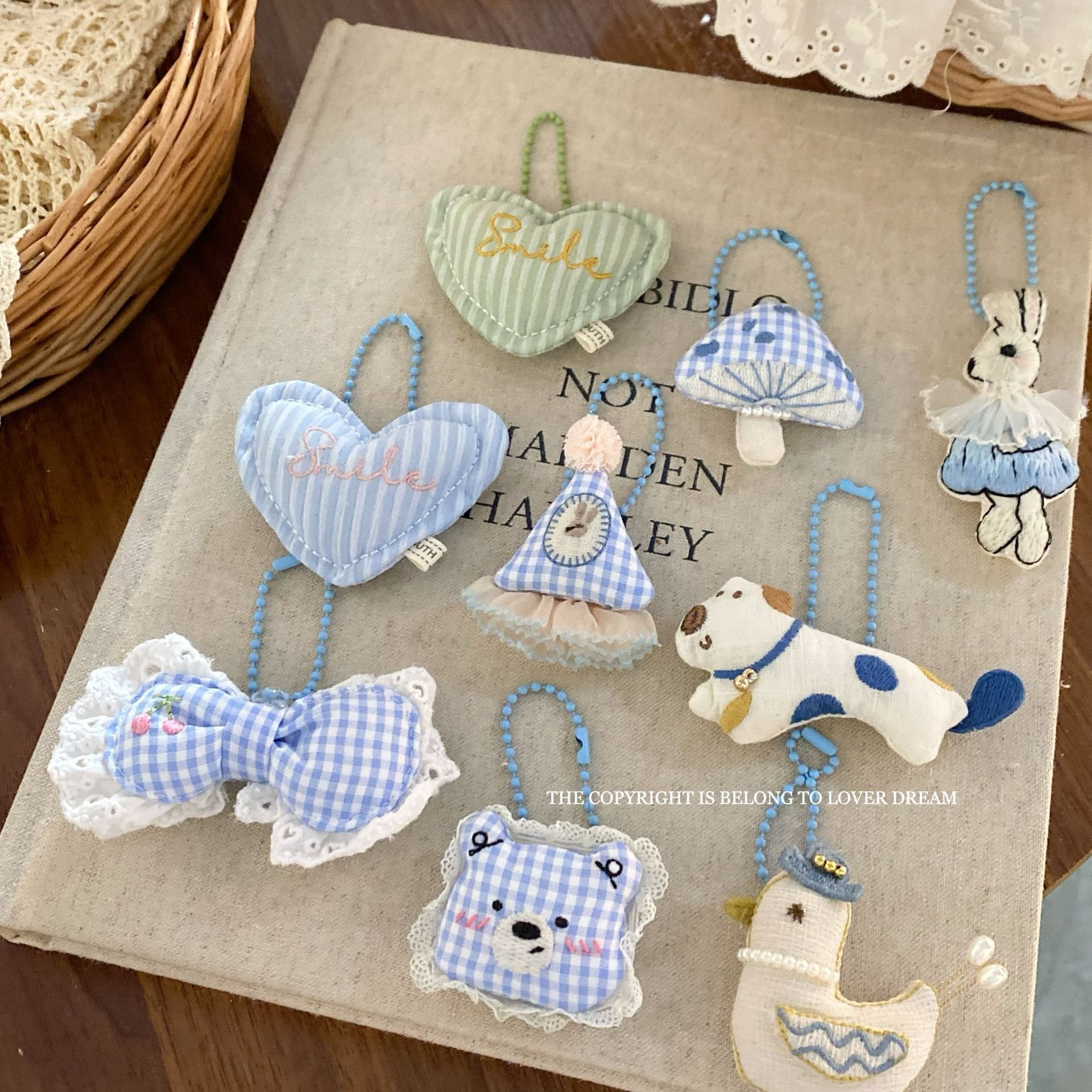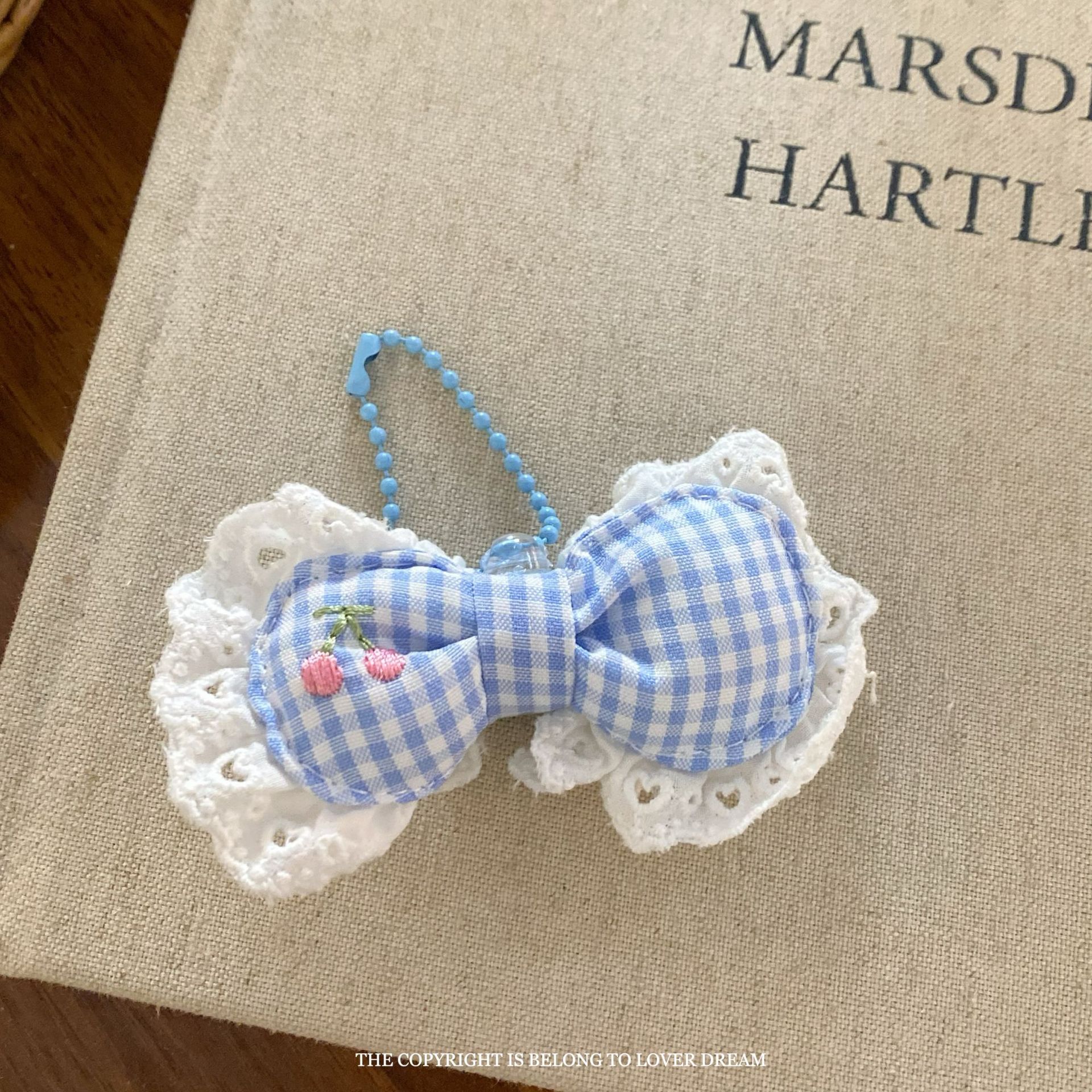 white lace edge cherry embroidery blue and white striped bow bead necklace
