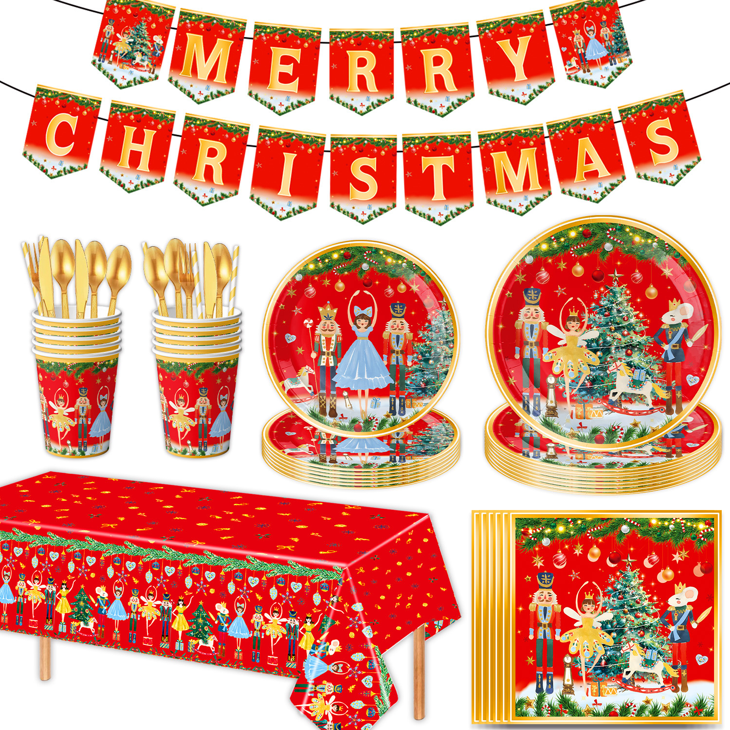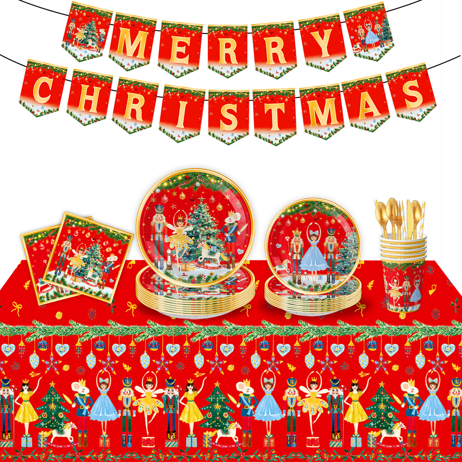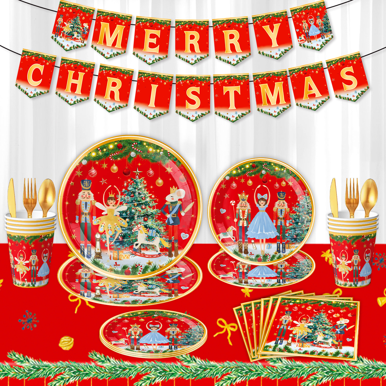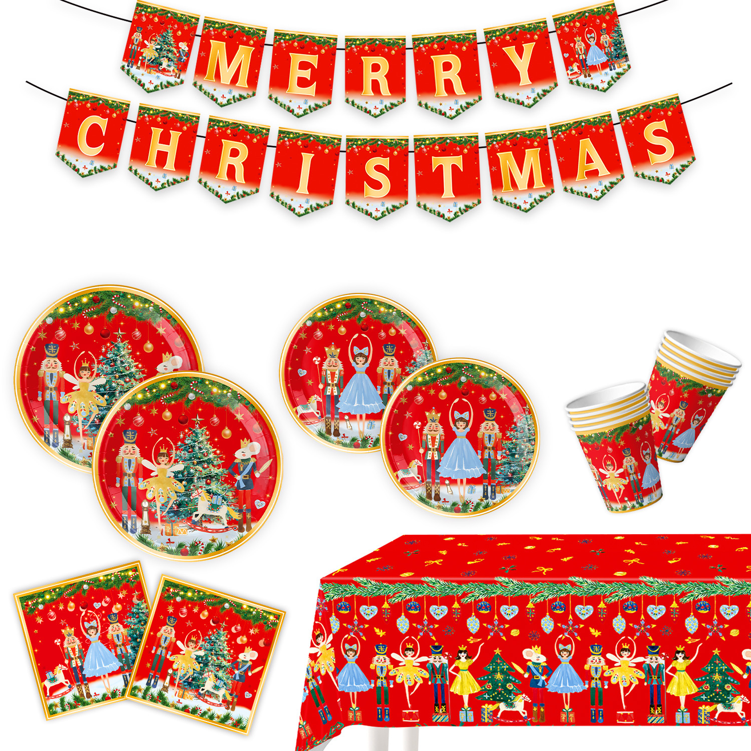 main picture 6-piece set (7-inch 10+9-inch 10 + tissue 20 + paper cup 10 + tablecloth 1 + hanging flag 1)-red christmas