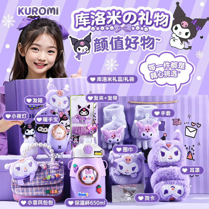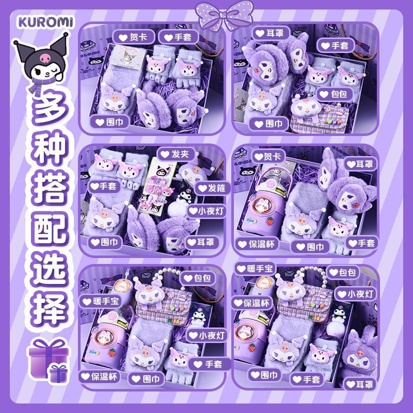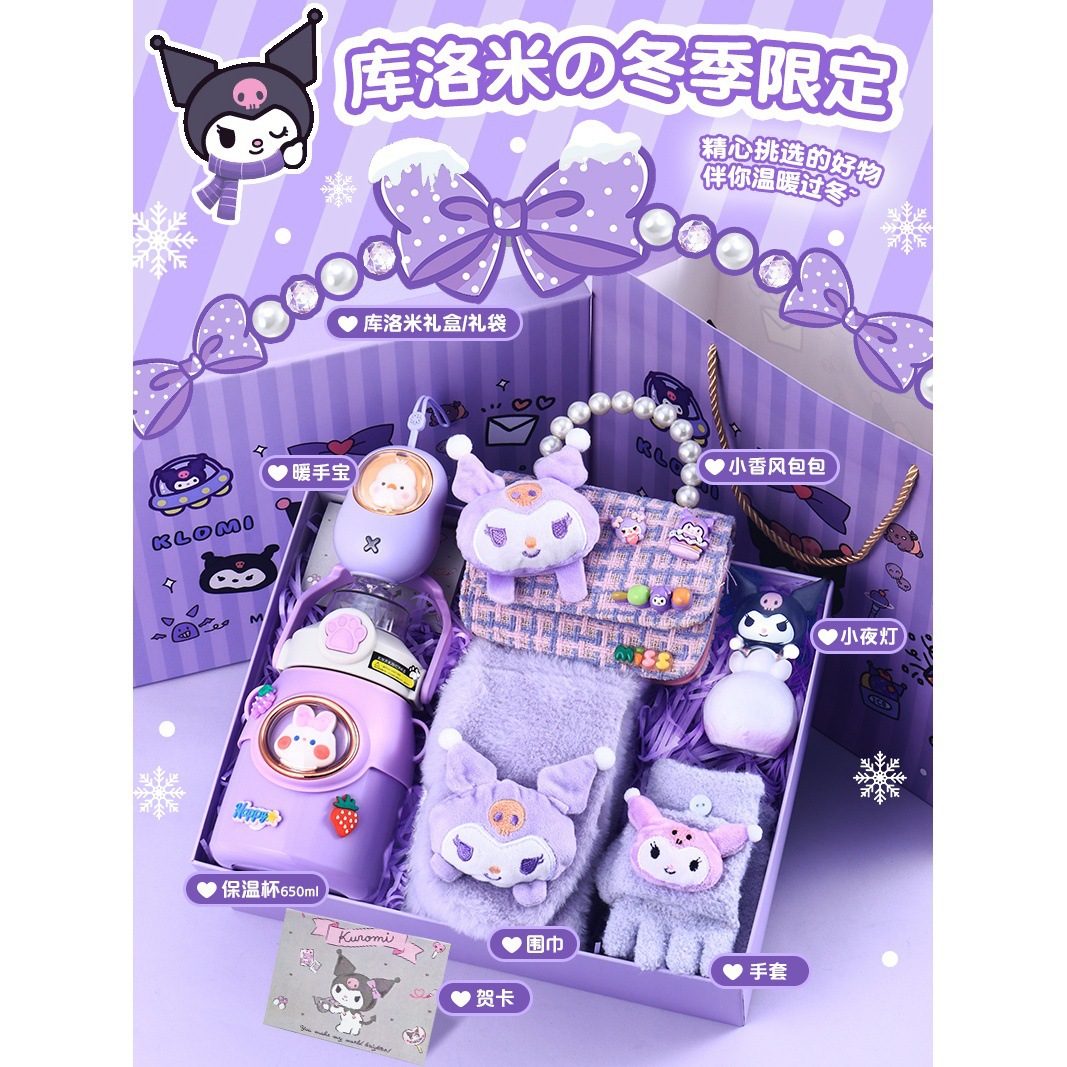 [scarf + gloves + earmuffs + hand warmer + thermos cup] (send greeting card + lighting chain + gift box + gift bag)