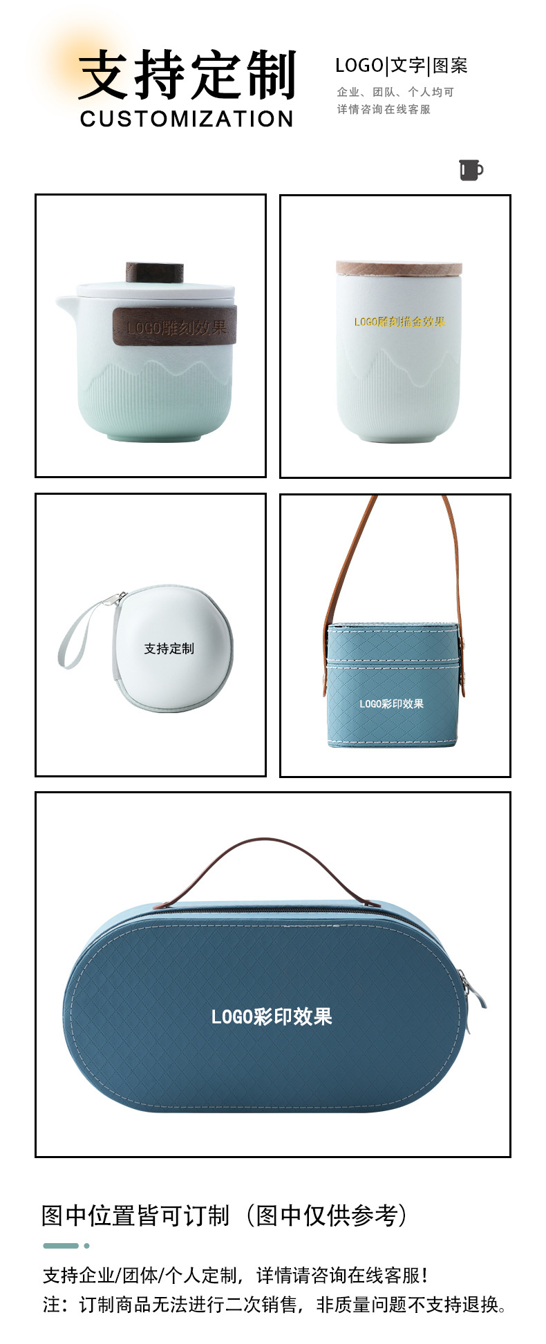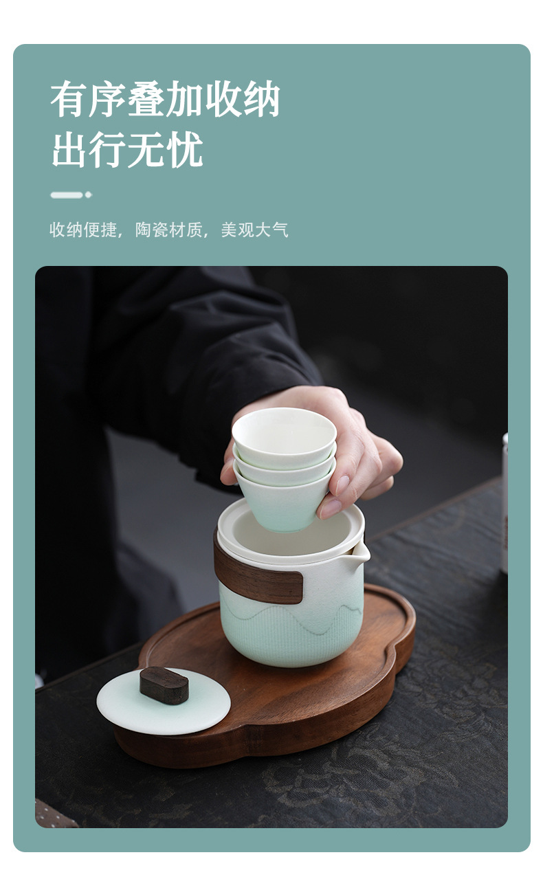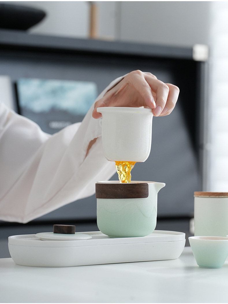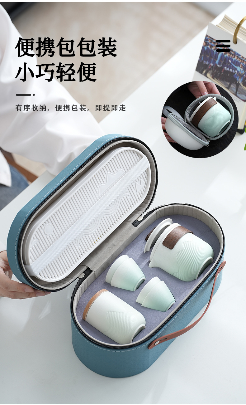 vertical pattern express pot + four cups + tea pot + tea tray + oval bag-cyan