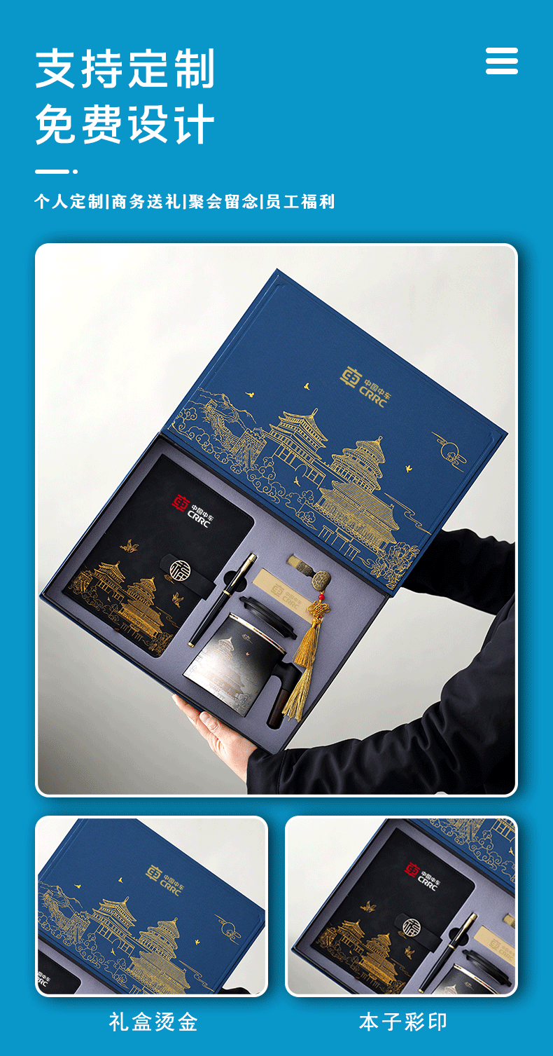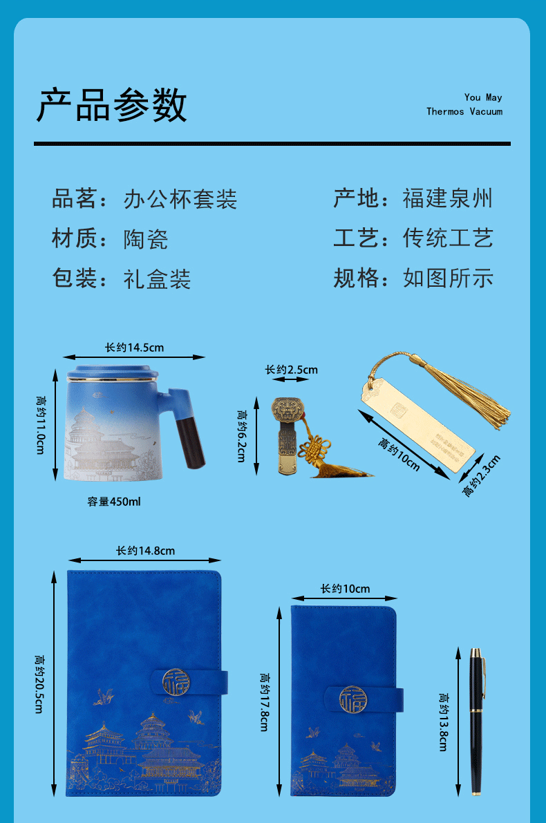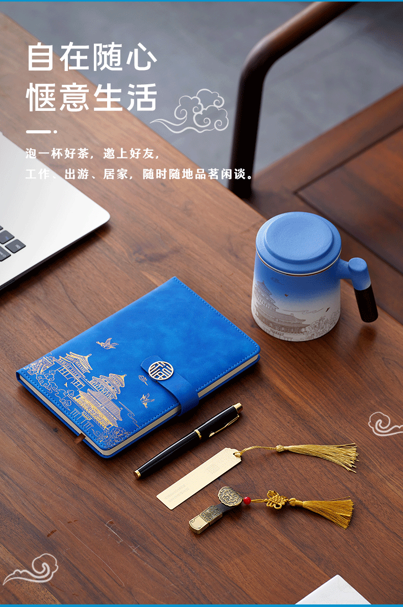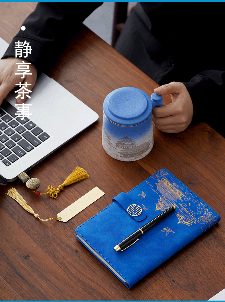 national fashion three-piece blue cup + pen + a6 notebook + gift box gift bag