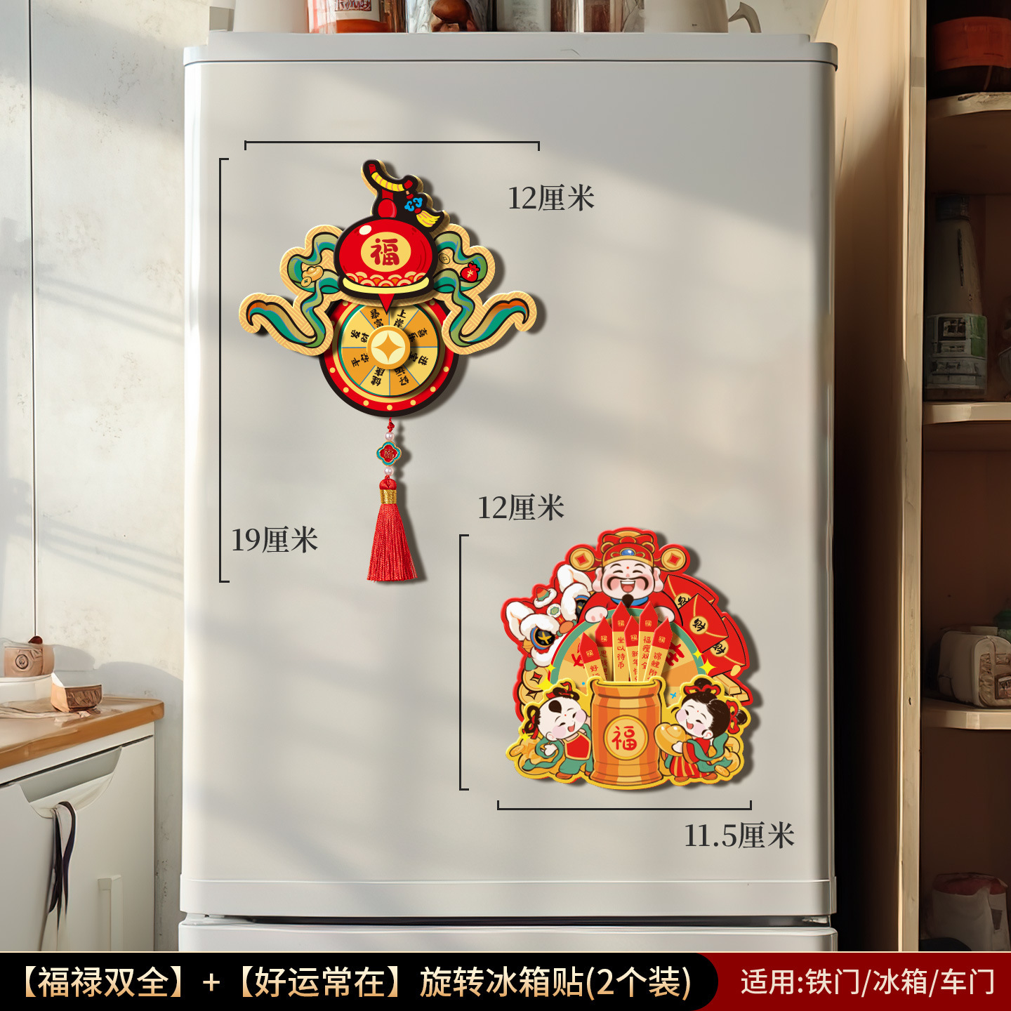[fu lu double full] + [new year be rich] rotating refridgerator magnets (2 in total)