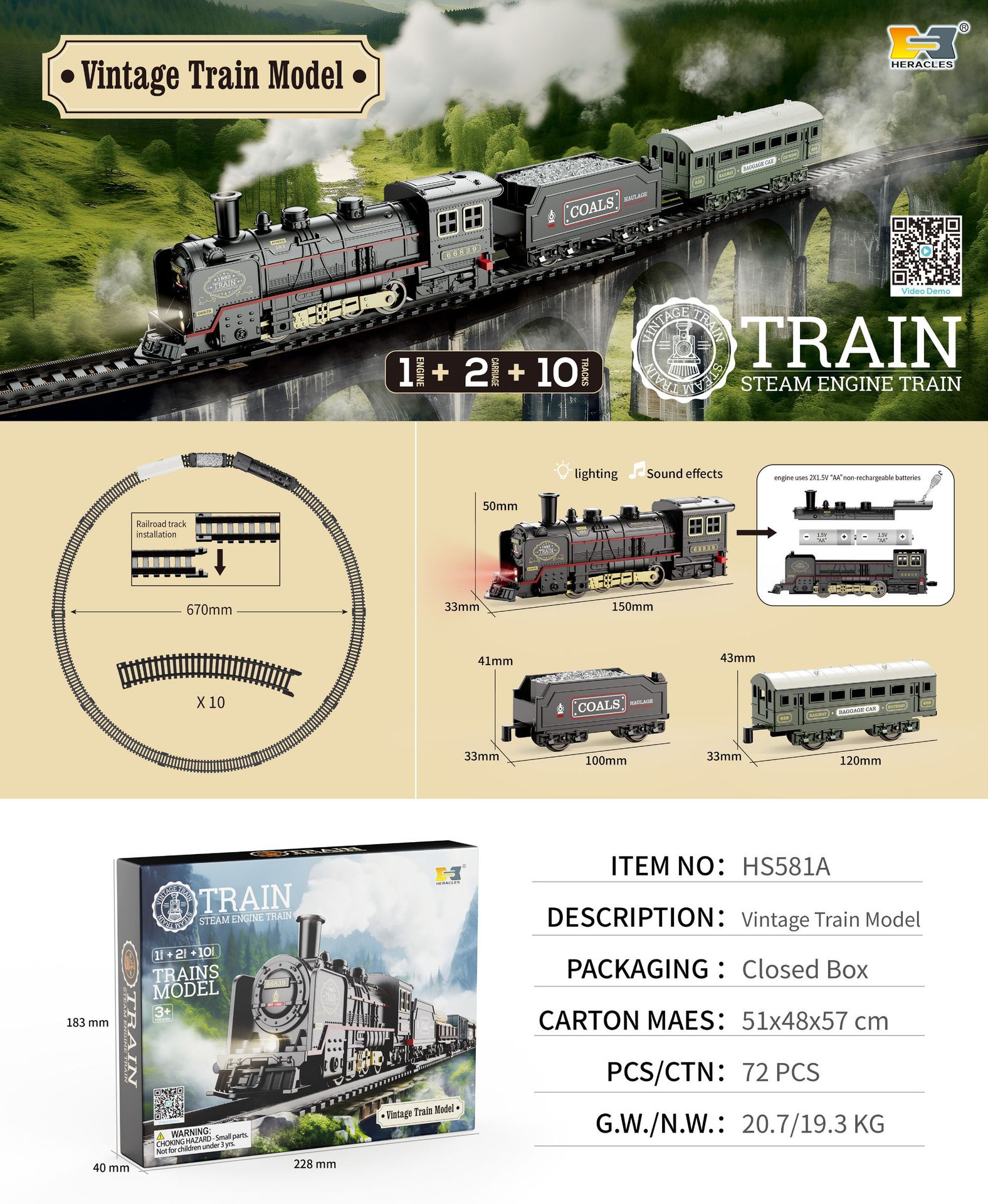 retro train model (1 front +2 carriages +10 tracks)