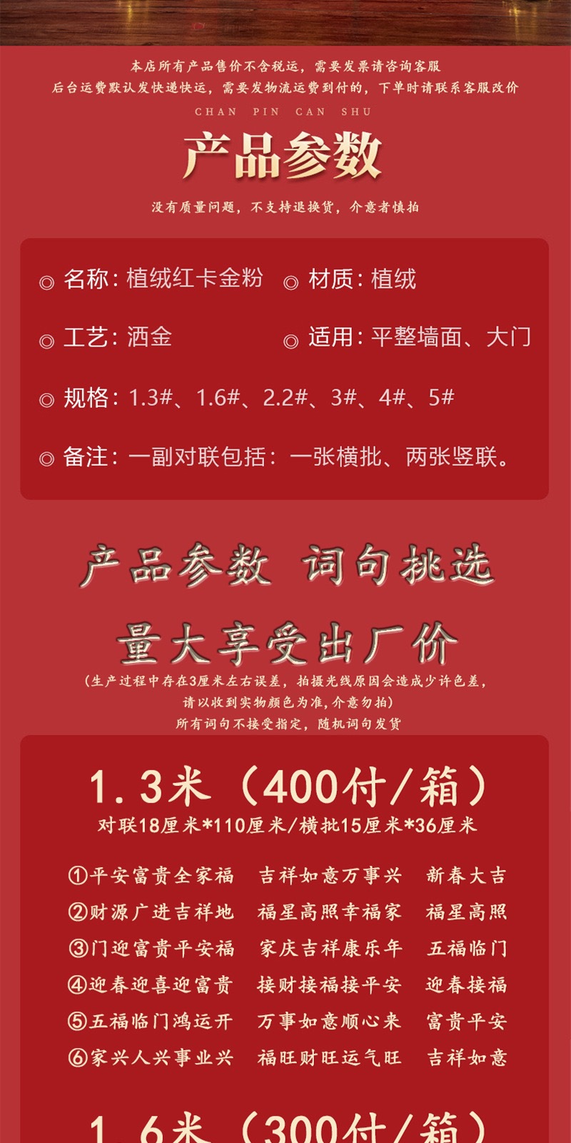 | 1.3 m [welcome to the spring, welcome to the rich and wealth, receive wealth, receive happiness, receive peace]] | CN¥ 3.9 | 5000 pair available |