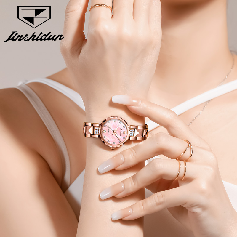 【Selling Point】: Fashionable week date style, stainless steel with ceramic bracelet! Daily wear is gentle and comfortable, with a fashionably feminine goddess style!