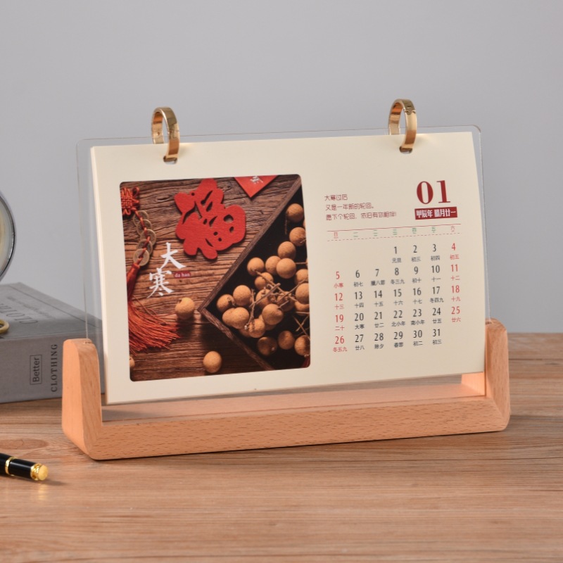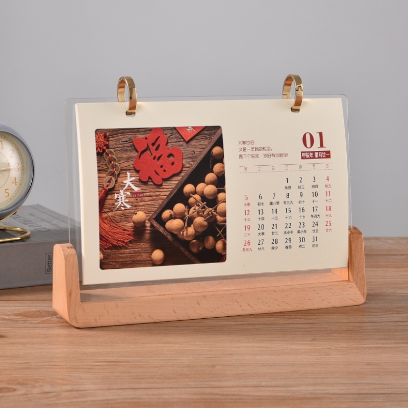 horizontal gold-plated plastic ring black peach wood color desk calendar with base
