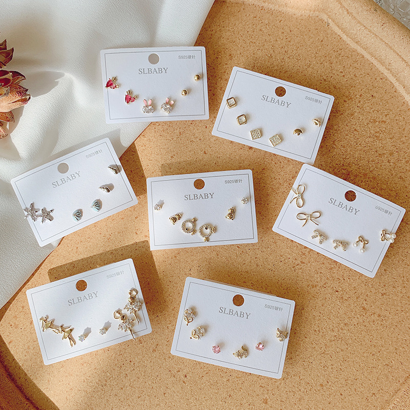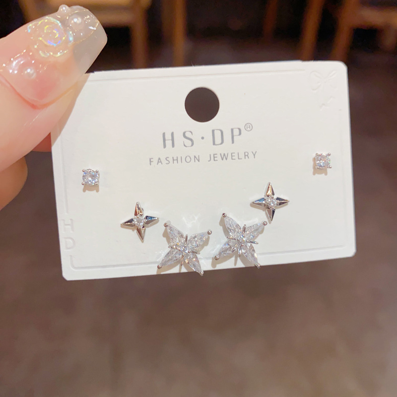 113# silver-zircon eight-pointed stars three-piece earrings (thick gold plating)
