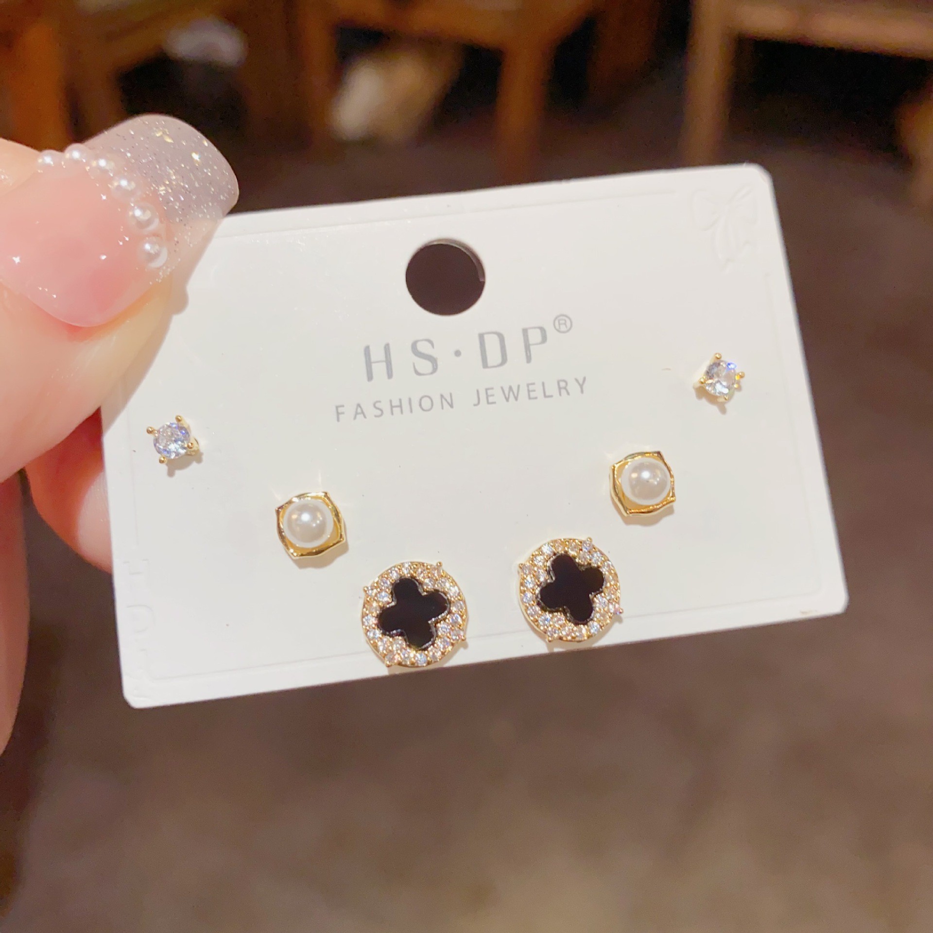 49# golden-micro-inlaid four-leaf flower pearl stud earrings combination