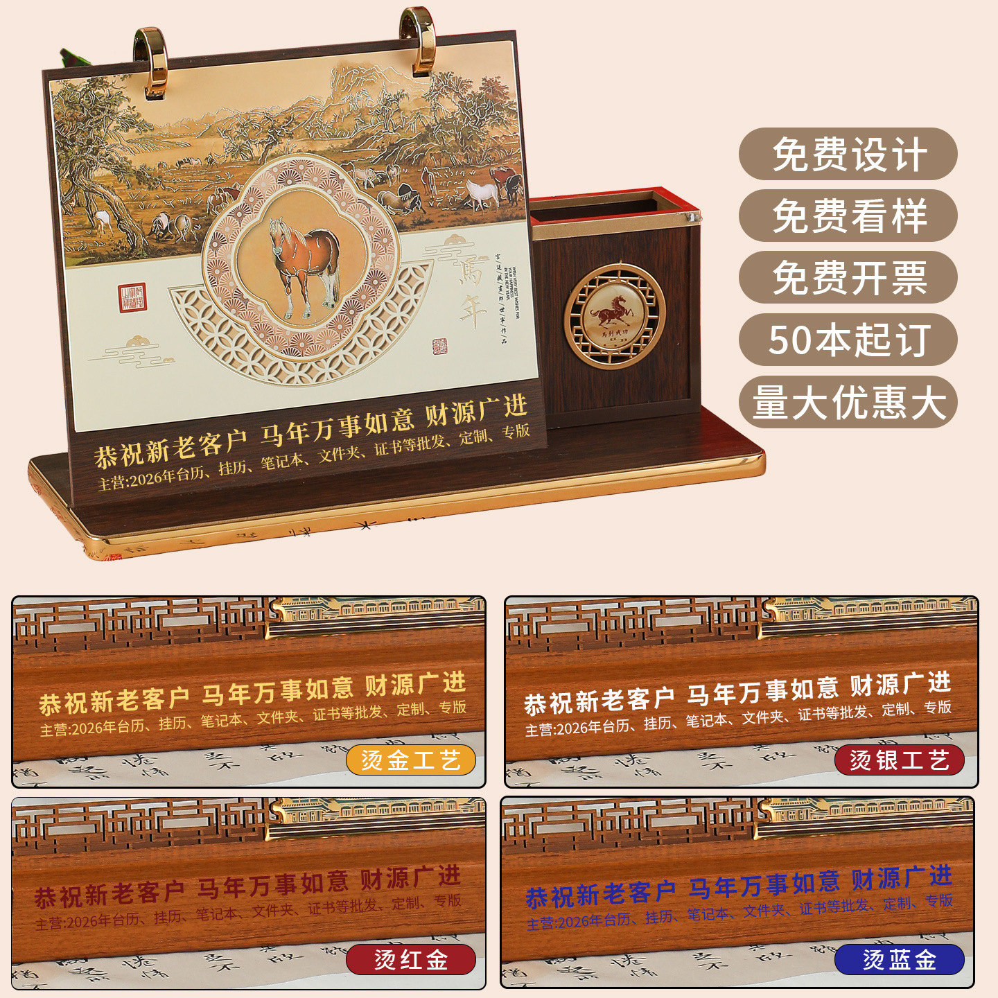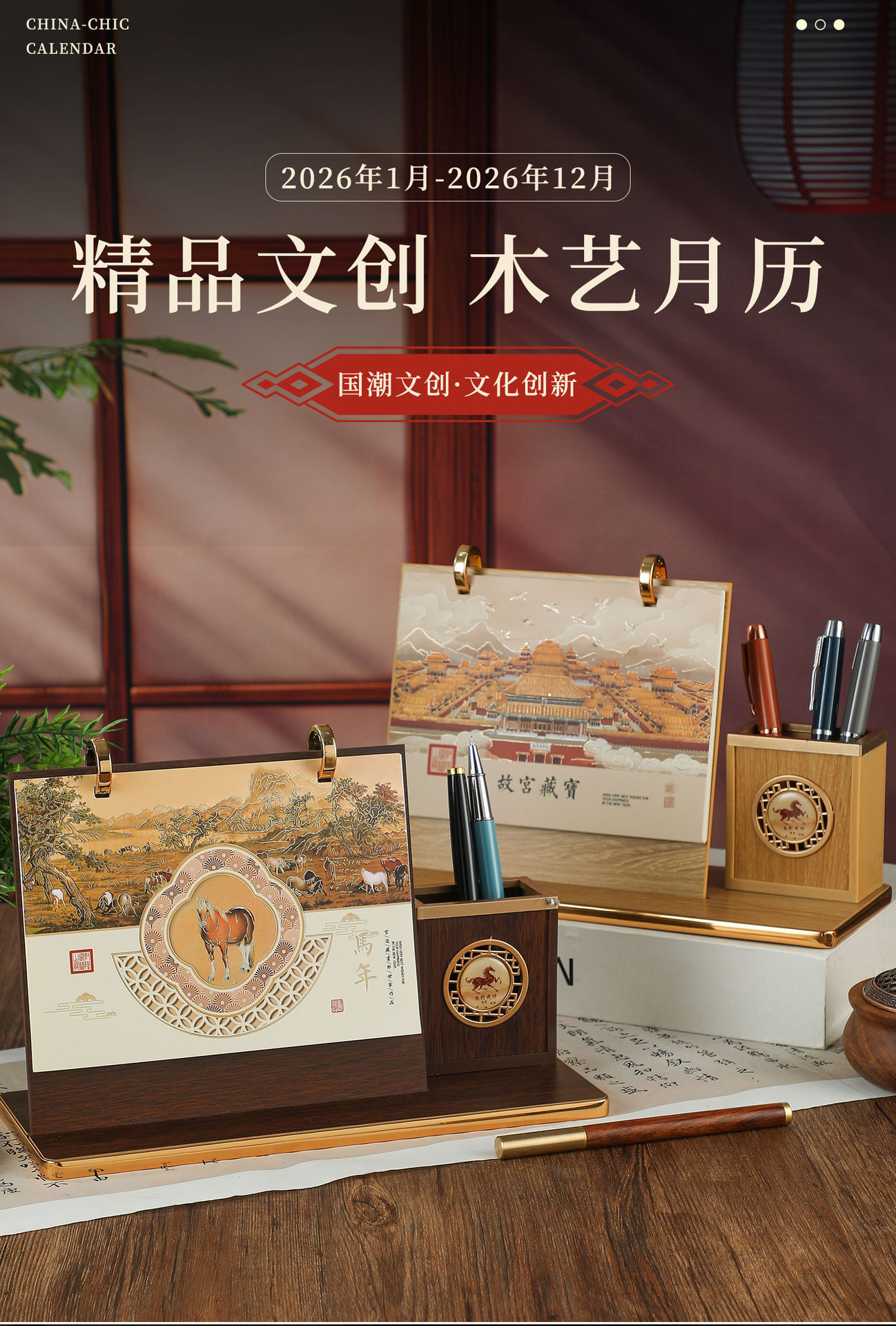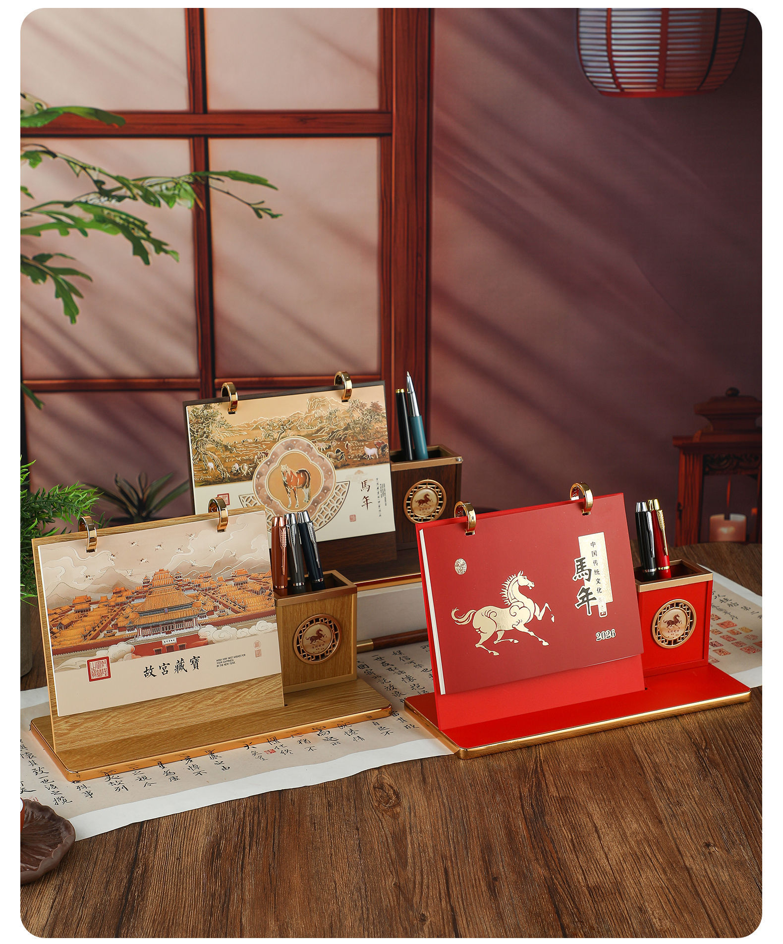 mahogany texture (desk calendar + pen holder + phnom penh)-year of the horse 2026