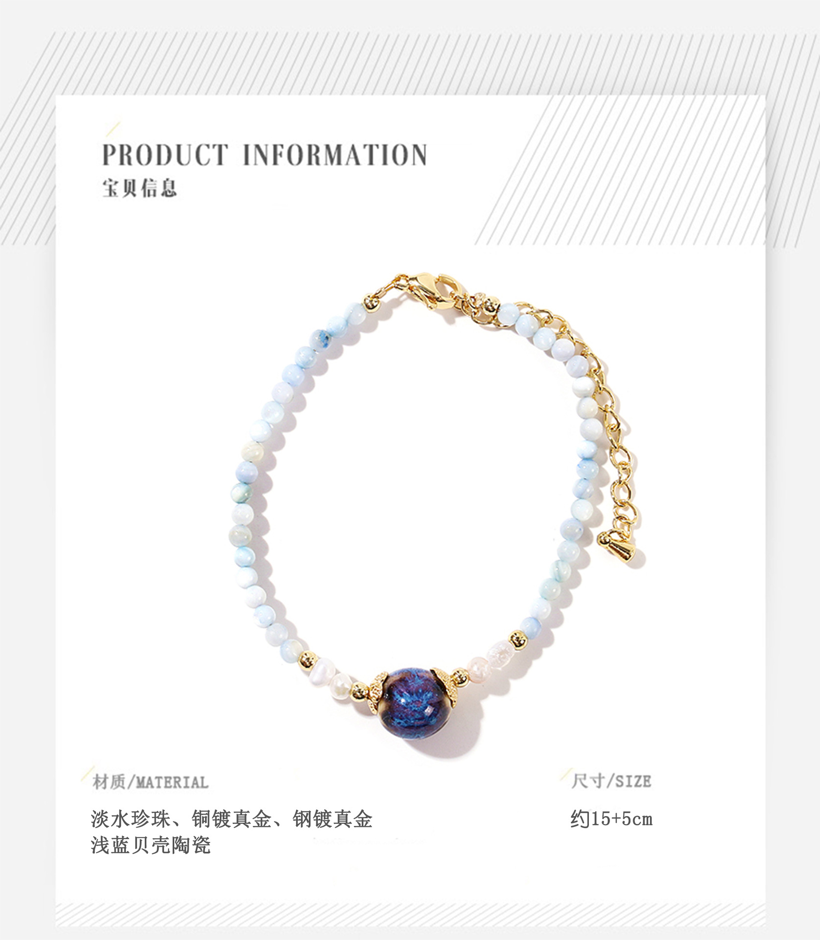 light blue shell ceramic pearl bracelet