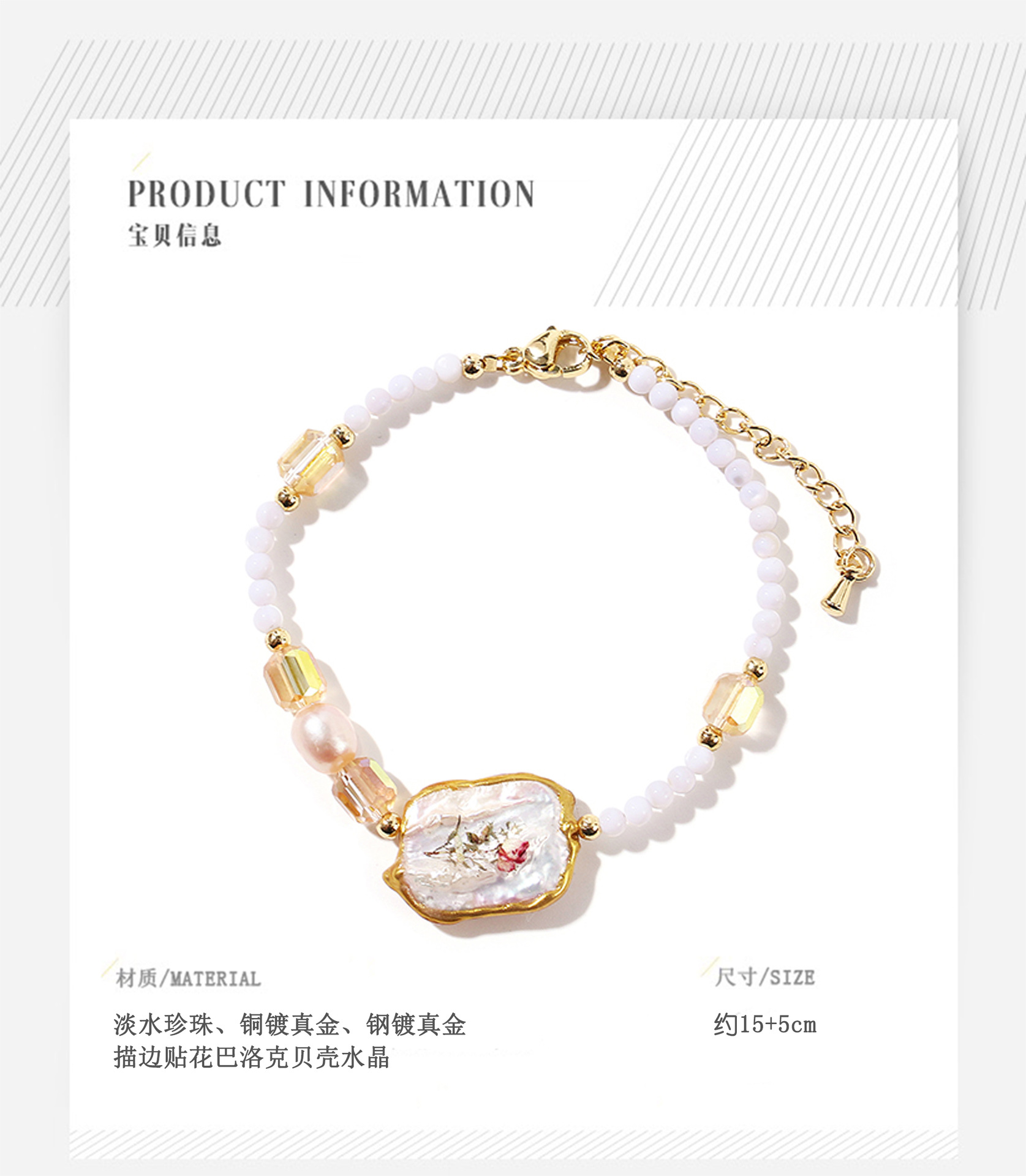 stroke applique baroque shell crystal pearl bracelet