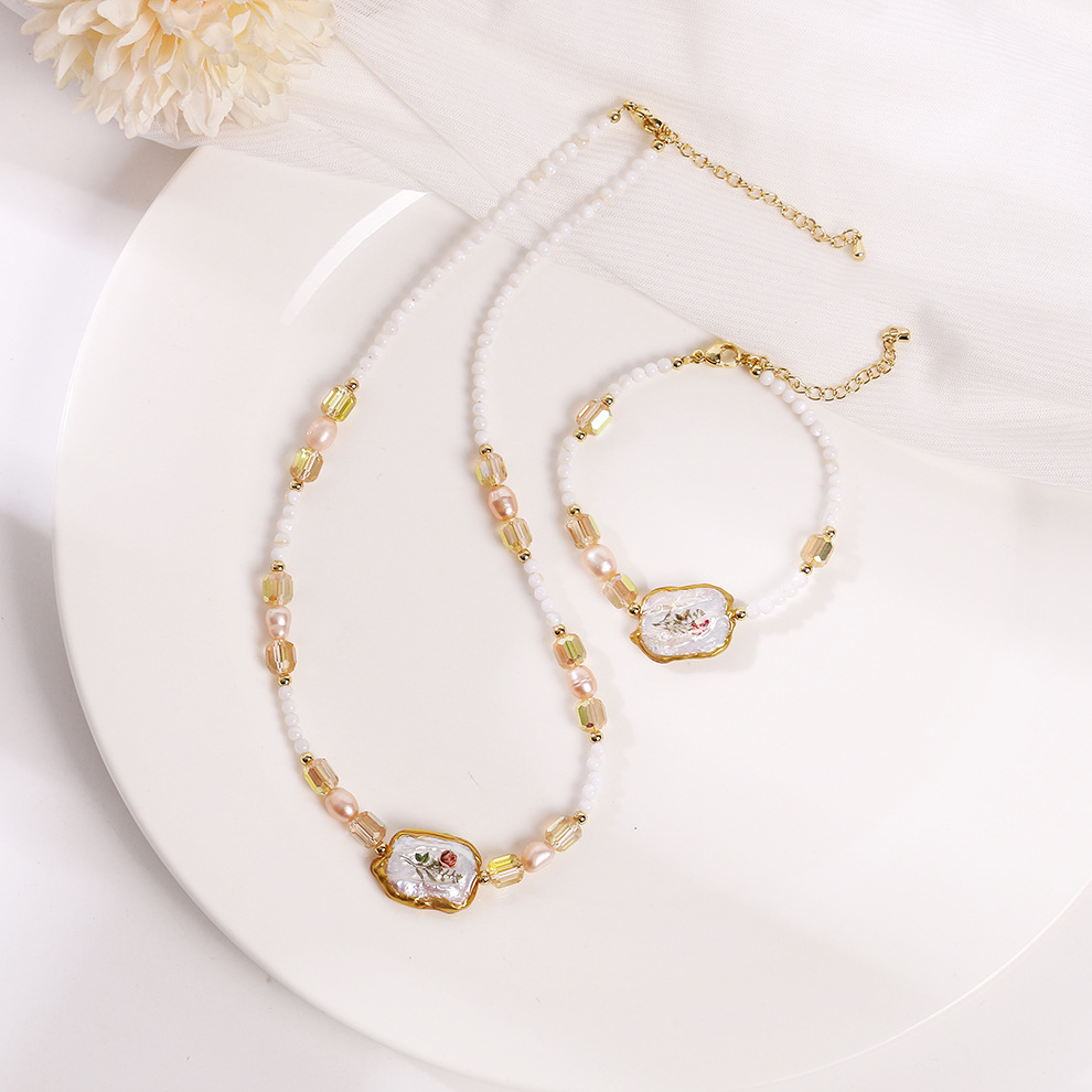 stroke applique baroque shell crystal pearl necklace