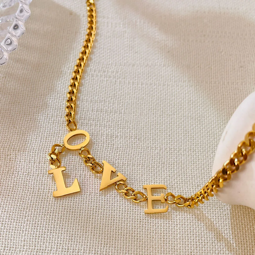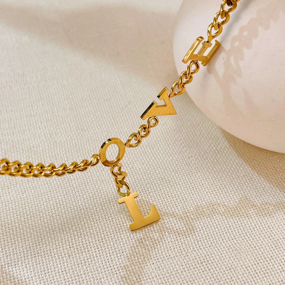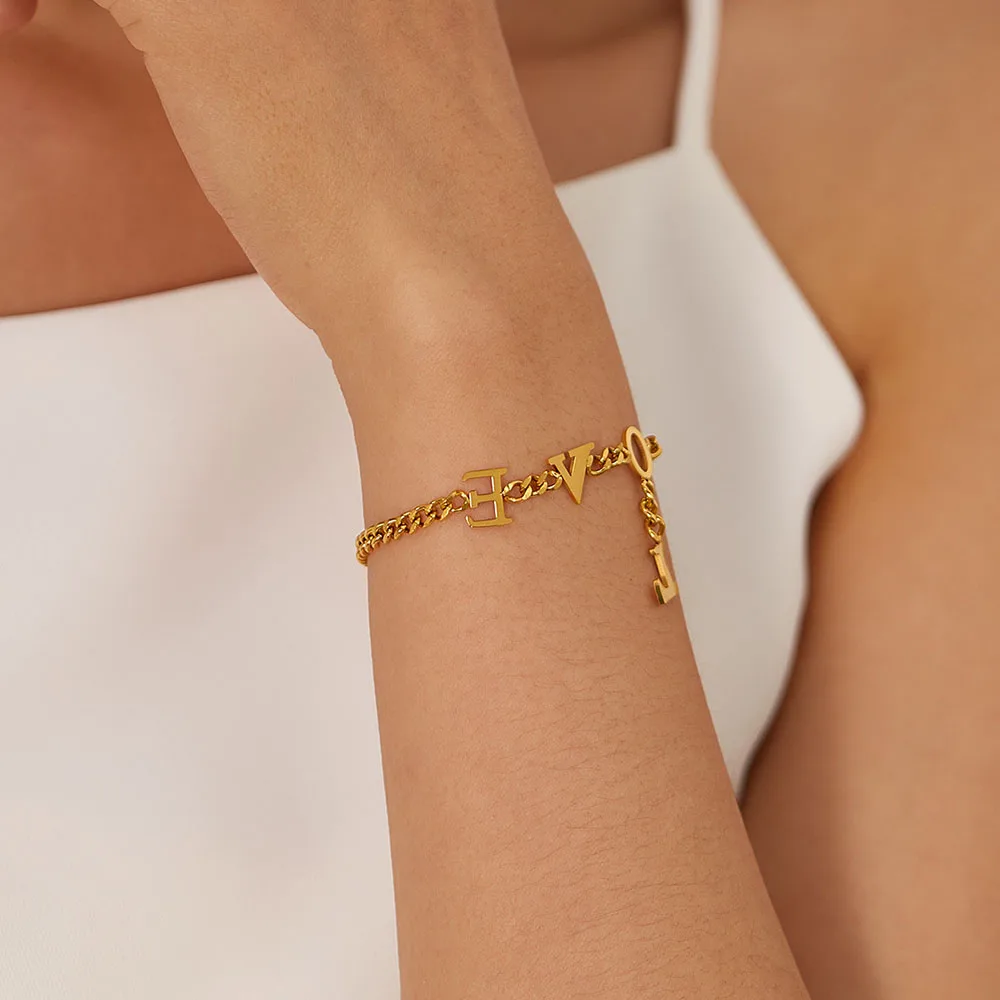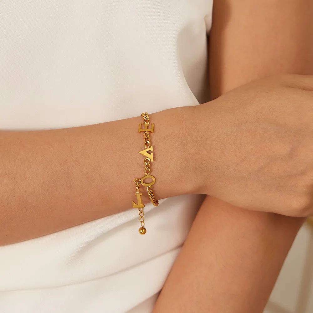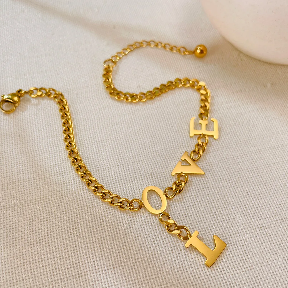 Ouj Fashion Jewelry 22CM 18K Gold Plated 316L Steel Adjustable Love Letters Pendant Chain Link Bracelets for Girls