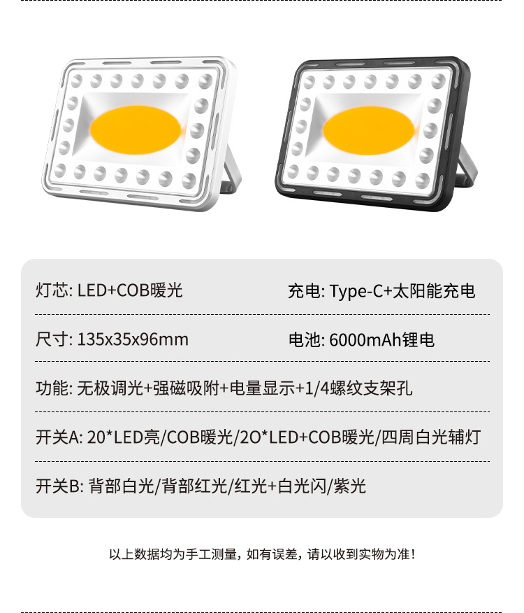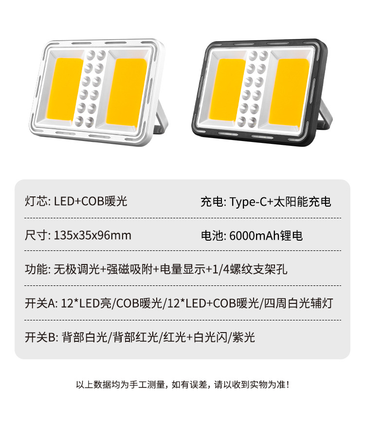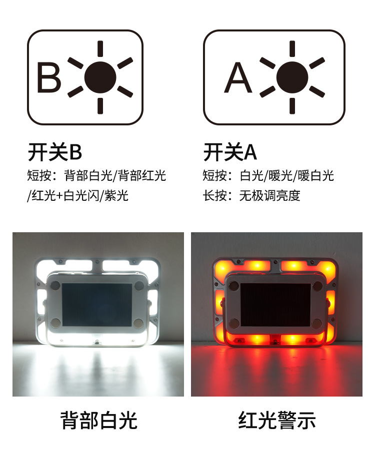 Switch A: 20*LED bright / COB warm light / 20*LED + COB warm light / white light auxiliary lights around