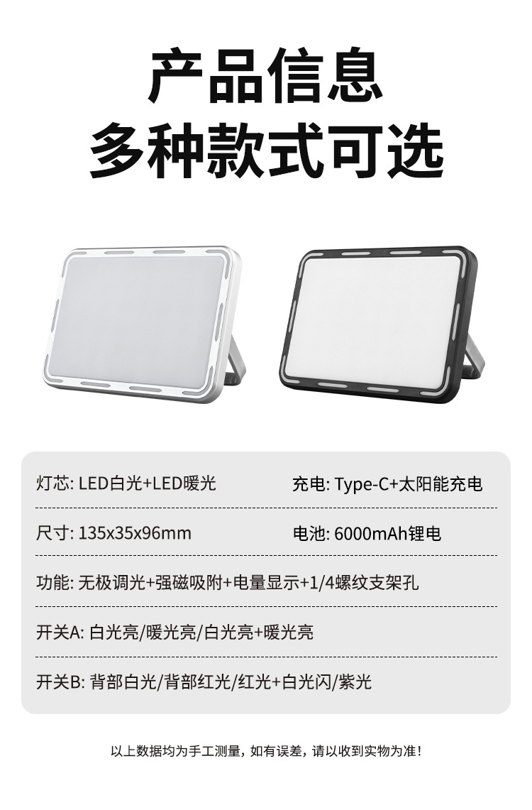 Function: Infinite dimmer + strong magnet attachment + battery level display + 1/4 thread mounting hole