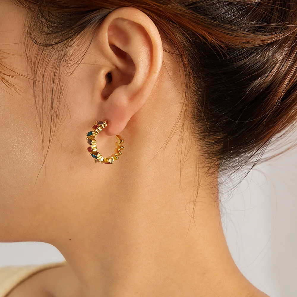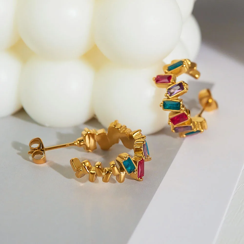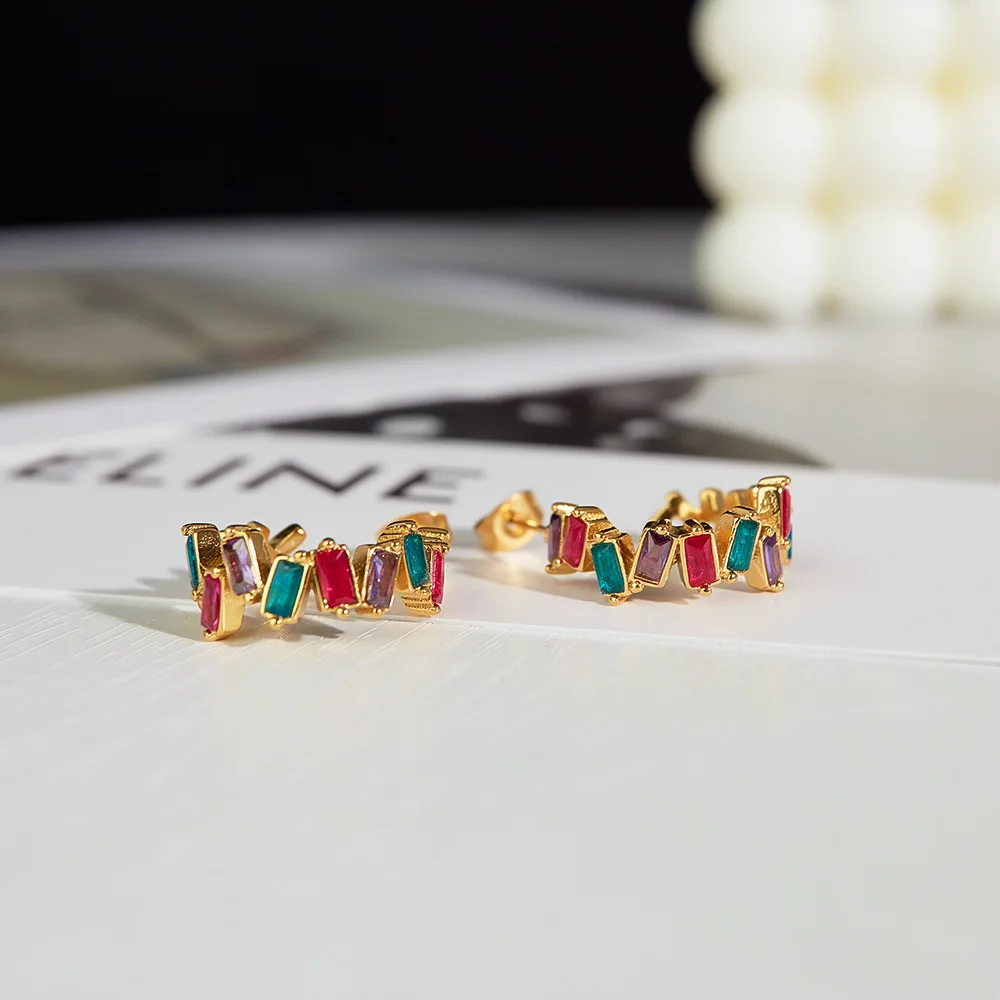 Ouj Luxury Fashion Irregular Unique Gold Plated Stainless Steel C-Shaped Colorful Cubic Zirconia Stud Earrings for Women