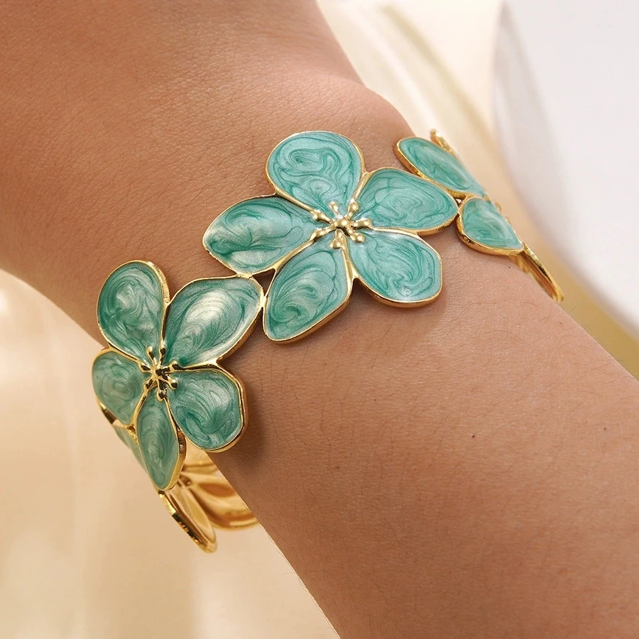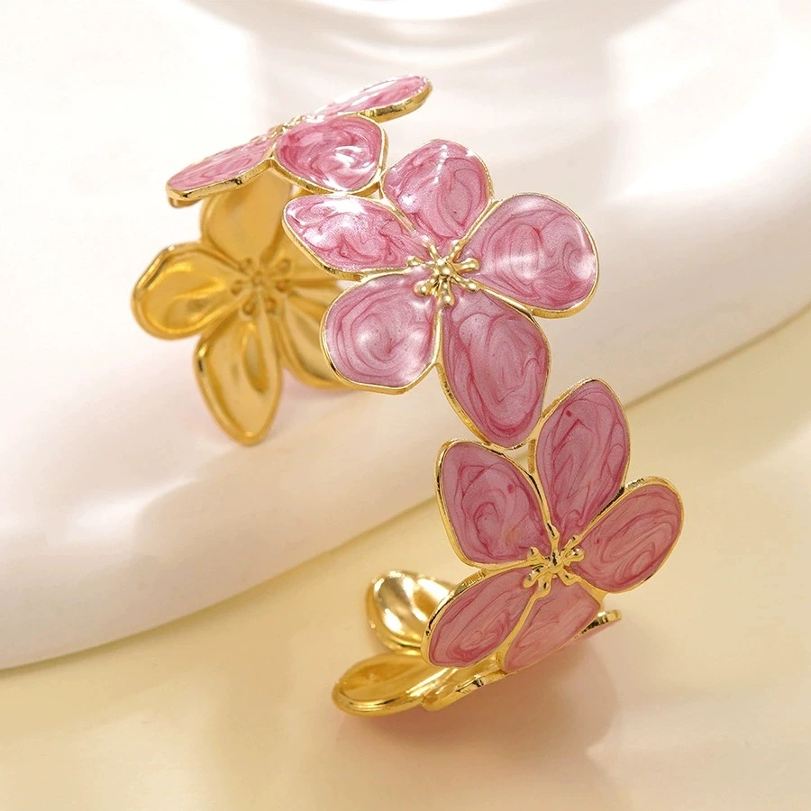 Ouj New Design Openable Stainless Steel Gold Plated Enamel Five Leaf Flower Bangle Bracelet for Lady
