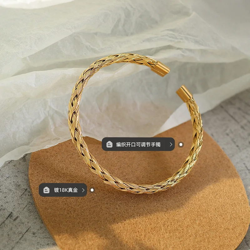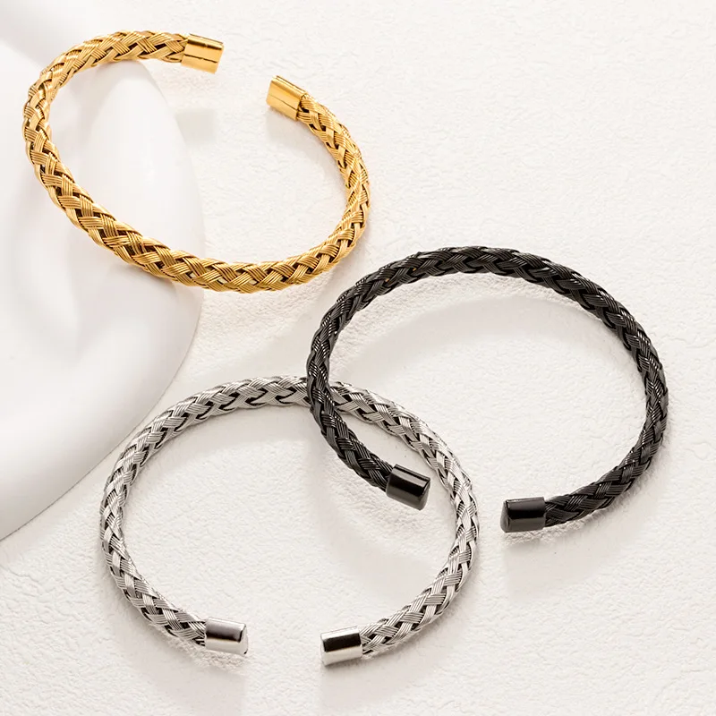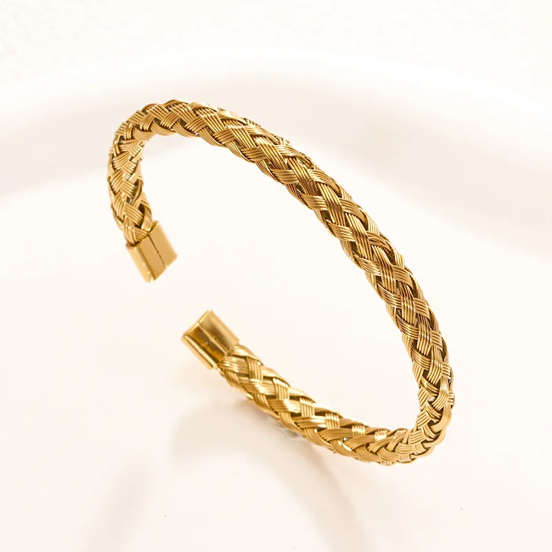 Ouj MenTwists Stainless Steel Fashion Woven Fried Dough Twists Open Bracelet Gold Plated Durable Titanium Cuff Unisex Bracelet