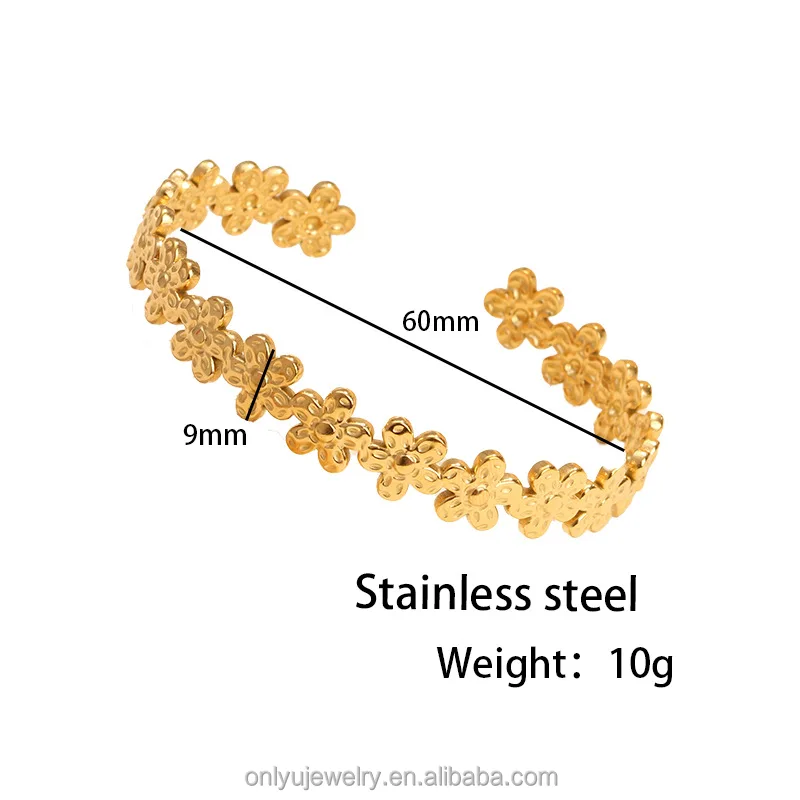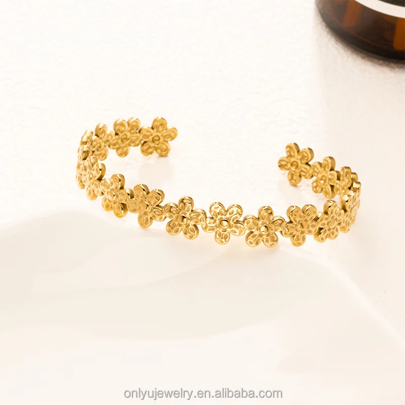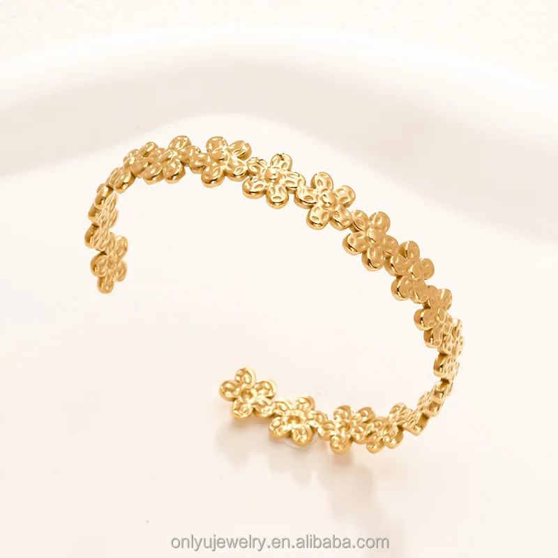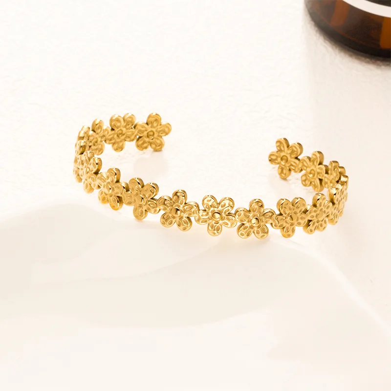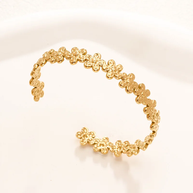 Quj Trendy Classic Flower Stainless Steel Open Cuff Retro Bracelet Wedding 18K Gold PVD Plated Titanium Bracelet for Girls Gift