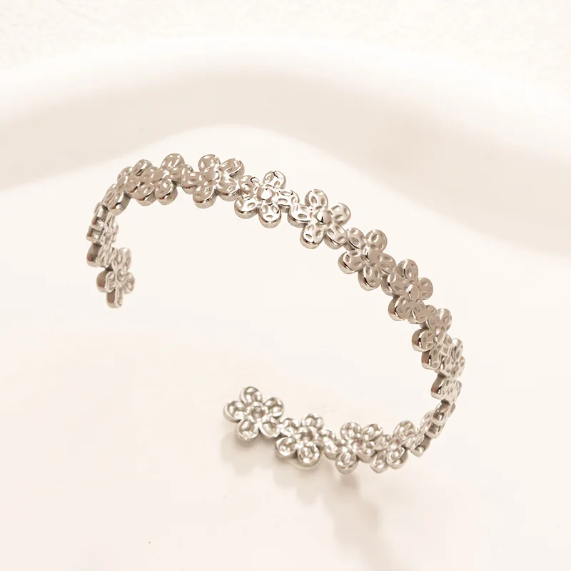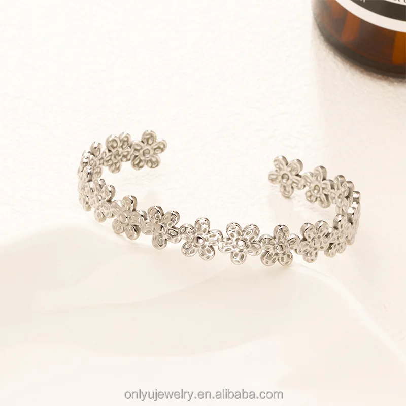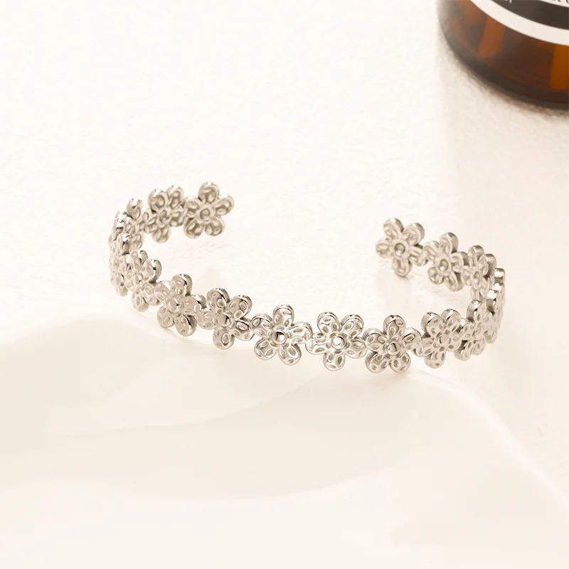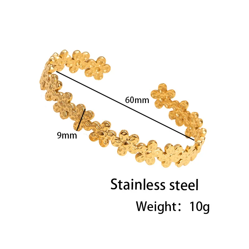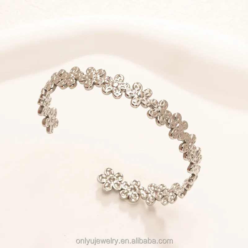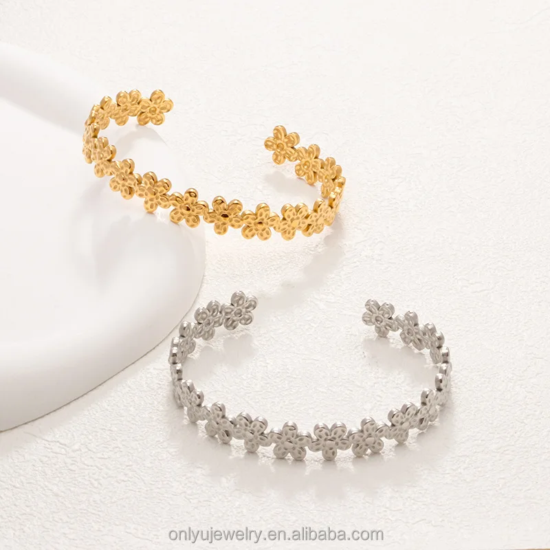 Quj Trendy Classic Flower Stainless Steel Open Cuff Retro Bracelet Wedding 18K Gold PVD Plated Titanium Bracelet for Girls Gift